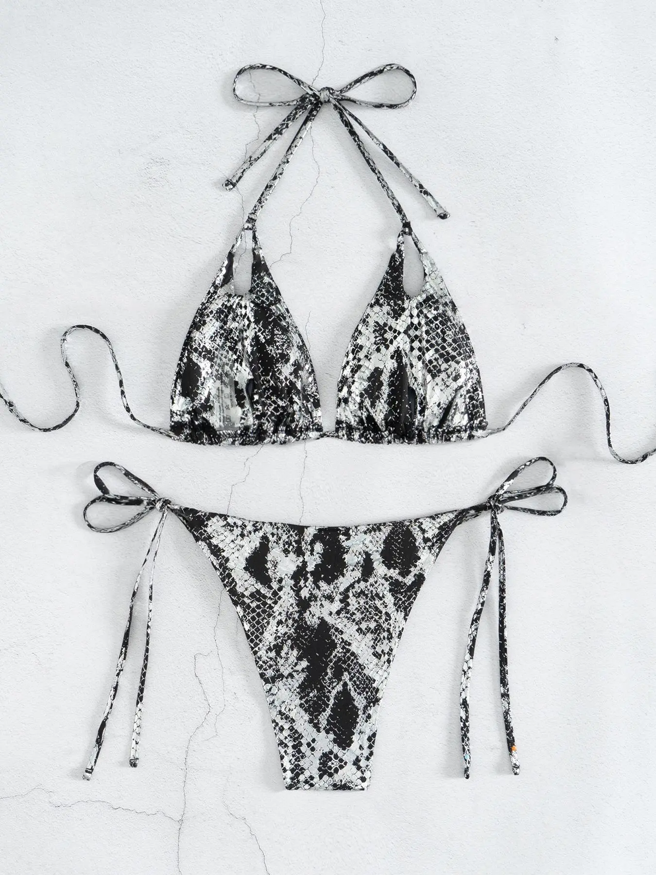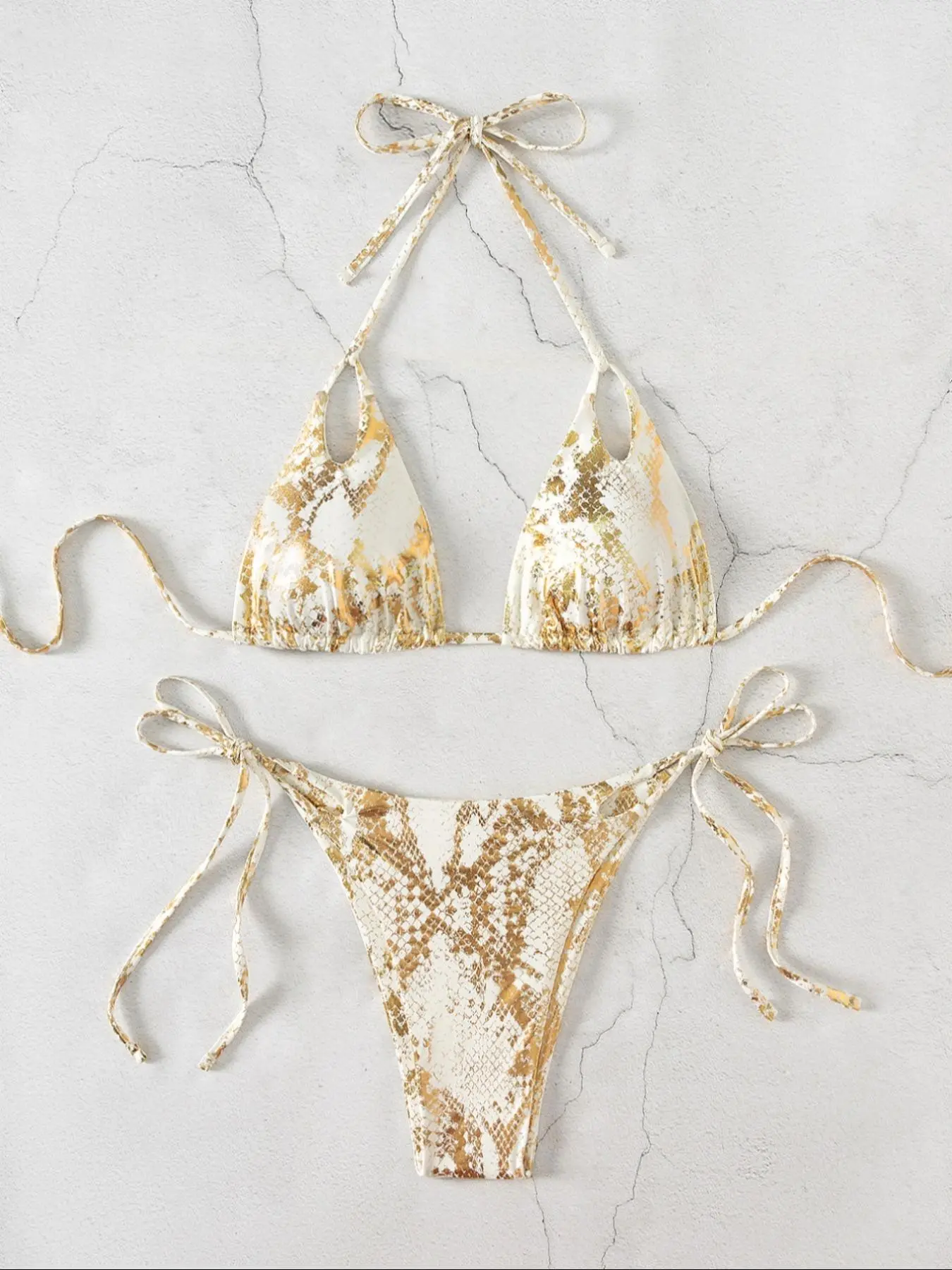 Two-Piece Set Women's Snakeskin Print Glossy String Bikini Set, Sporty Halter Neck Tie Back Triangle Swim Bra & Tie Side High Cut Swim Panty, Two-piece Swimsuit for Beach Holiday Vacation Tie Back Bikinis