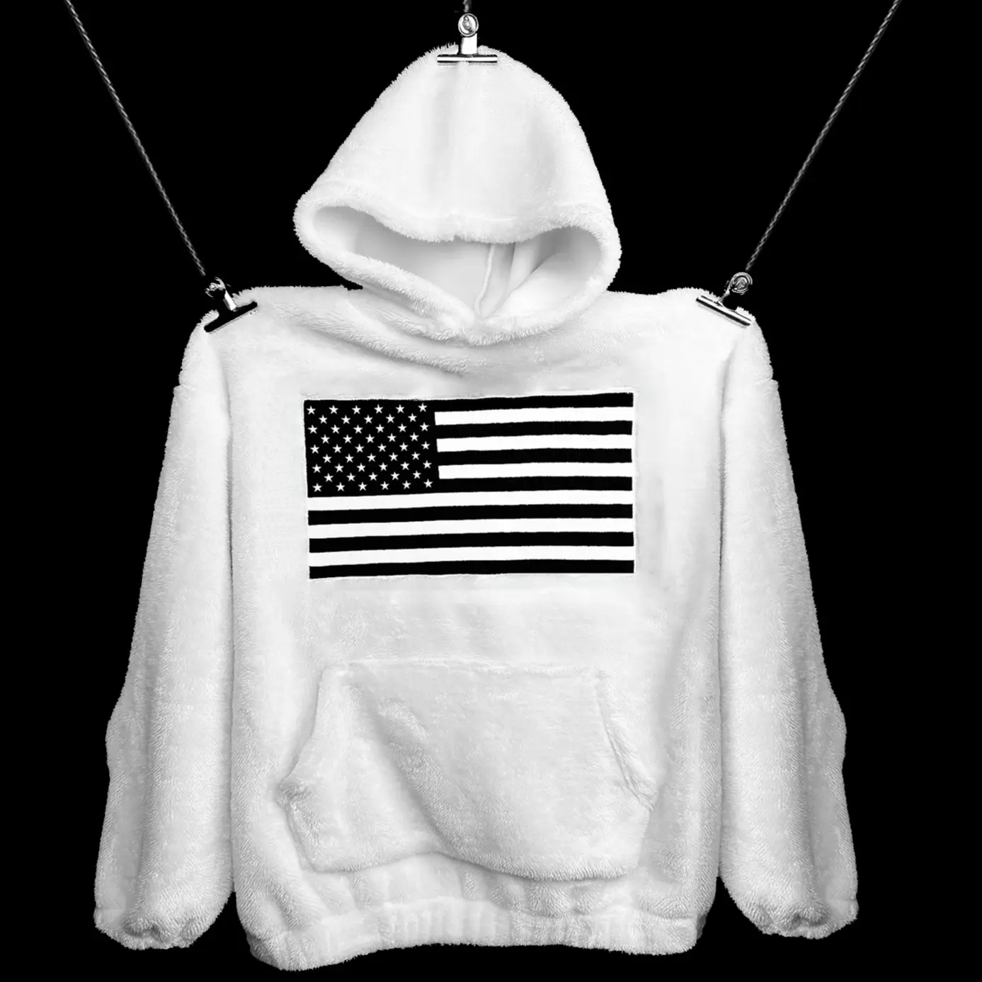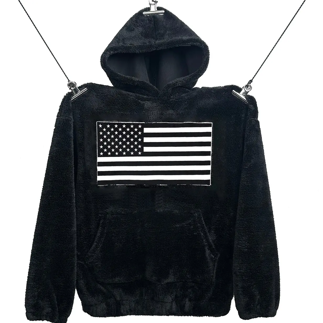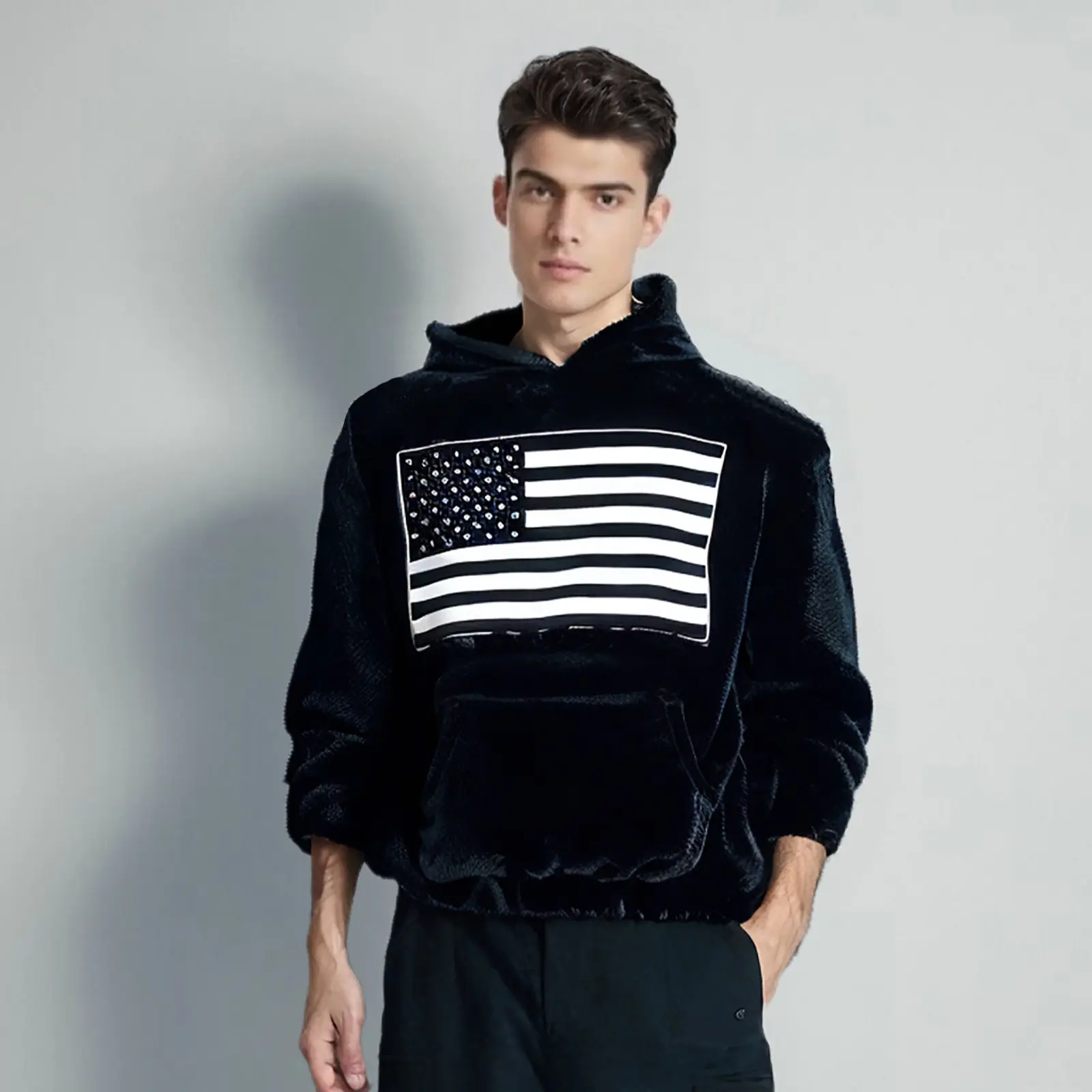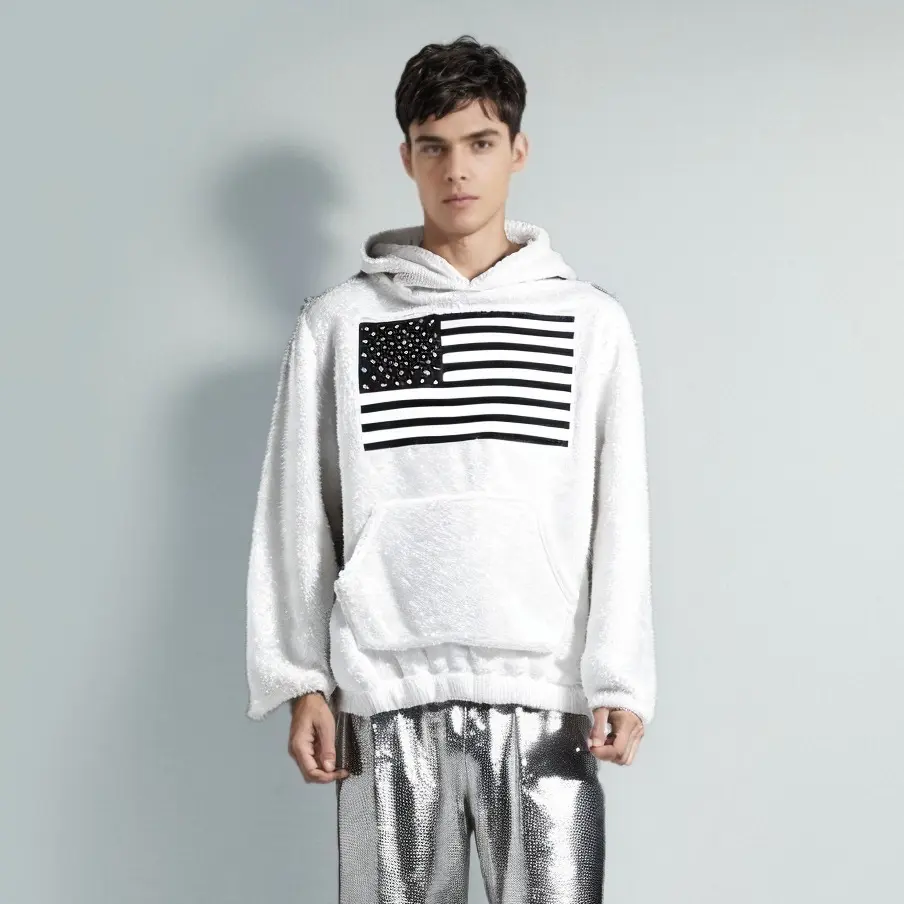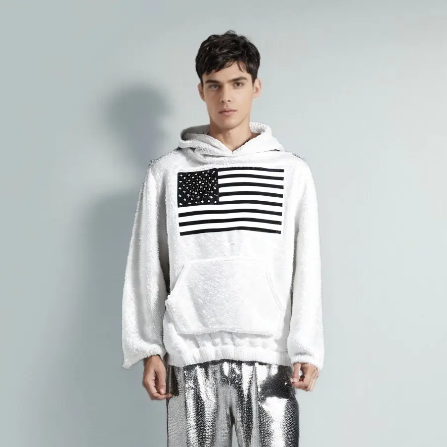 You can choose classic pure white or pure black, which is both versatile and fashionable. The front of the sweatshirt is printed with a picture of the American flag, which is a unique design and full of personality. The edges of the picture are processed with alignment, which adds a sense of hierarchy and three-dimensionality, making the whole more delicate and unique.