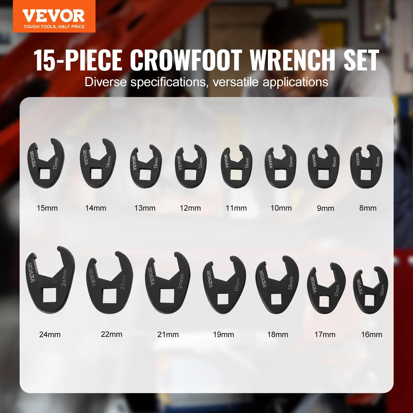 • Diverse Specifications: In different repair scenarios, various tool sizes are required. Our crowfoot wrench set gathers 3/8" drive sizes 8mm, 9mm, 10mm, 11mm, 12mm, 13mm, 14mm, 15mm, 16mm, 17mm, 18mm, and 19 mm, totaling 12 pieces, and 1/2" drive sizes: 21mm, 22mm, and 24mm, totaling 3 pieces. This ensures you can handle different fasteners and bolts effortlessly, making you well-equipped for various tasks.