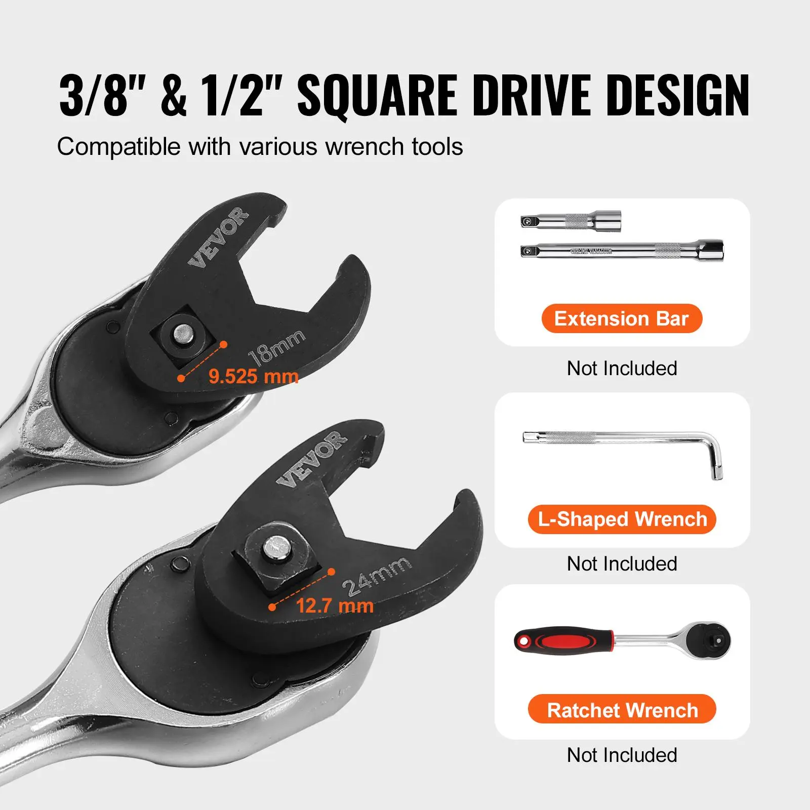 Our 3/8" and 1/2" square head designed crow foot wrenches set boasts high compatibility with extension bars, ratchets, torque wrenches, and more. It's perfect for securing and removing components in tight or small spaces.
