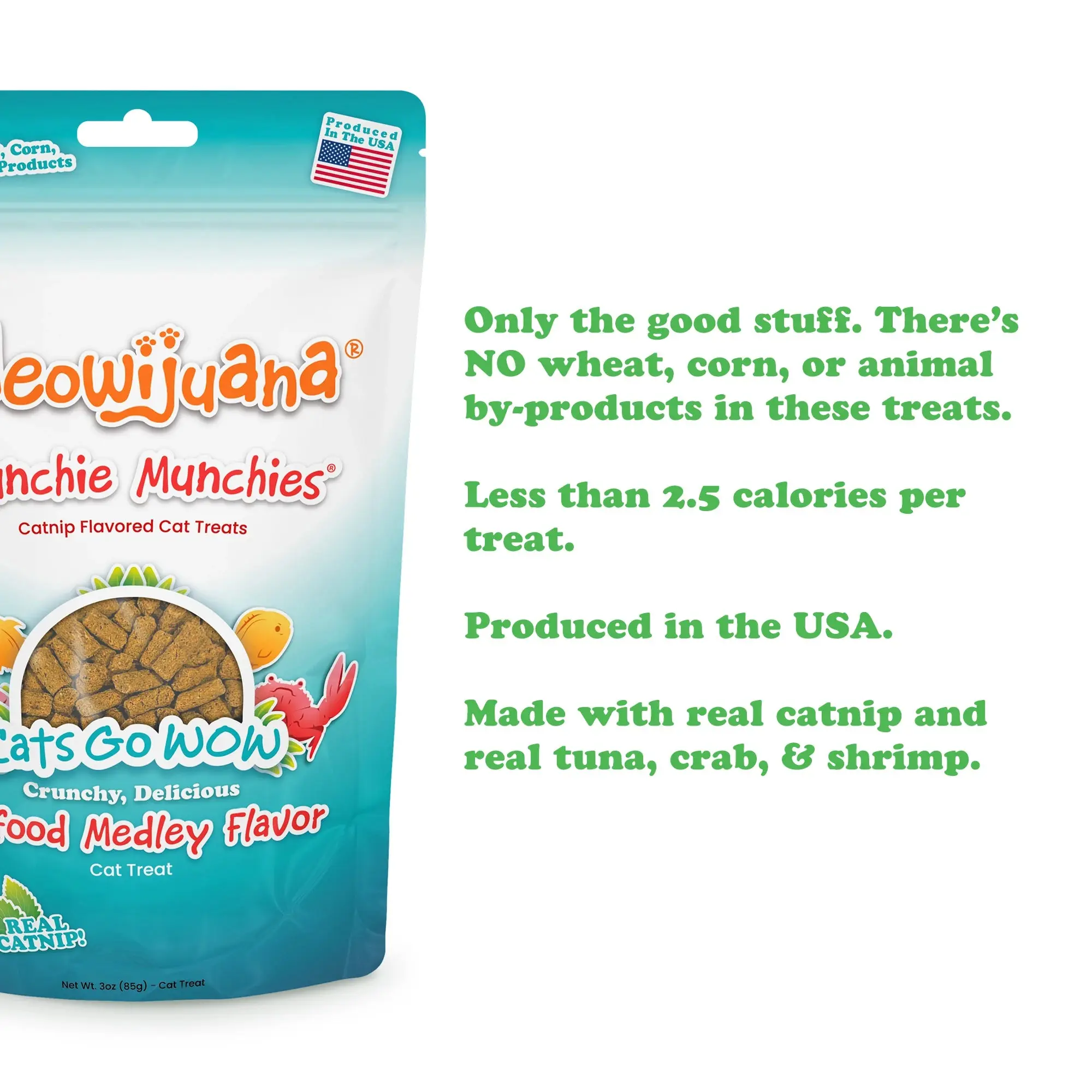Introducing Meowijuana Crunchie Munchies Seafood and Catnip Cat Treats – the purrfect cat treat that’s bound to make your feline flip! This one-of-a-kind, irresistible cat treat is carefully crafted in the USA with high-quality ingredients that are guaranteed to satisfy even the pickiest of snackers. Infused with catnip magic, each crunchy bite is a guilt-free delight, packed with flavor your cat will adore and with fewer than 2.5 calories per treat. Give your kitty a snack that brings on the purrs while keeping them fit and fabulous!