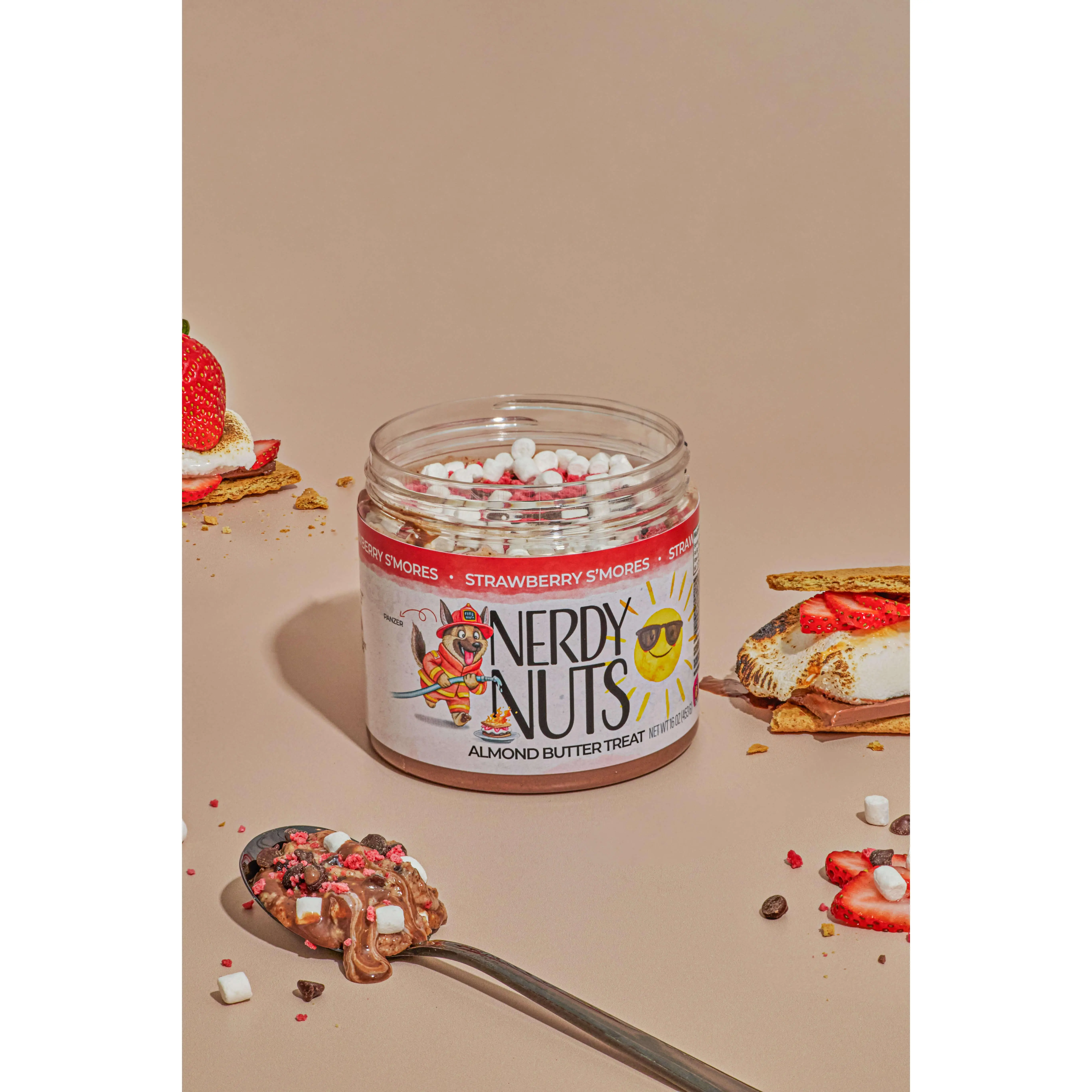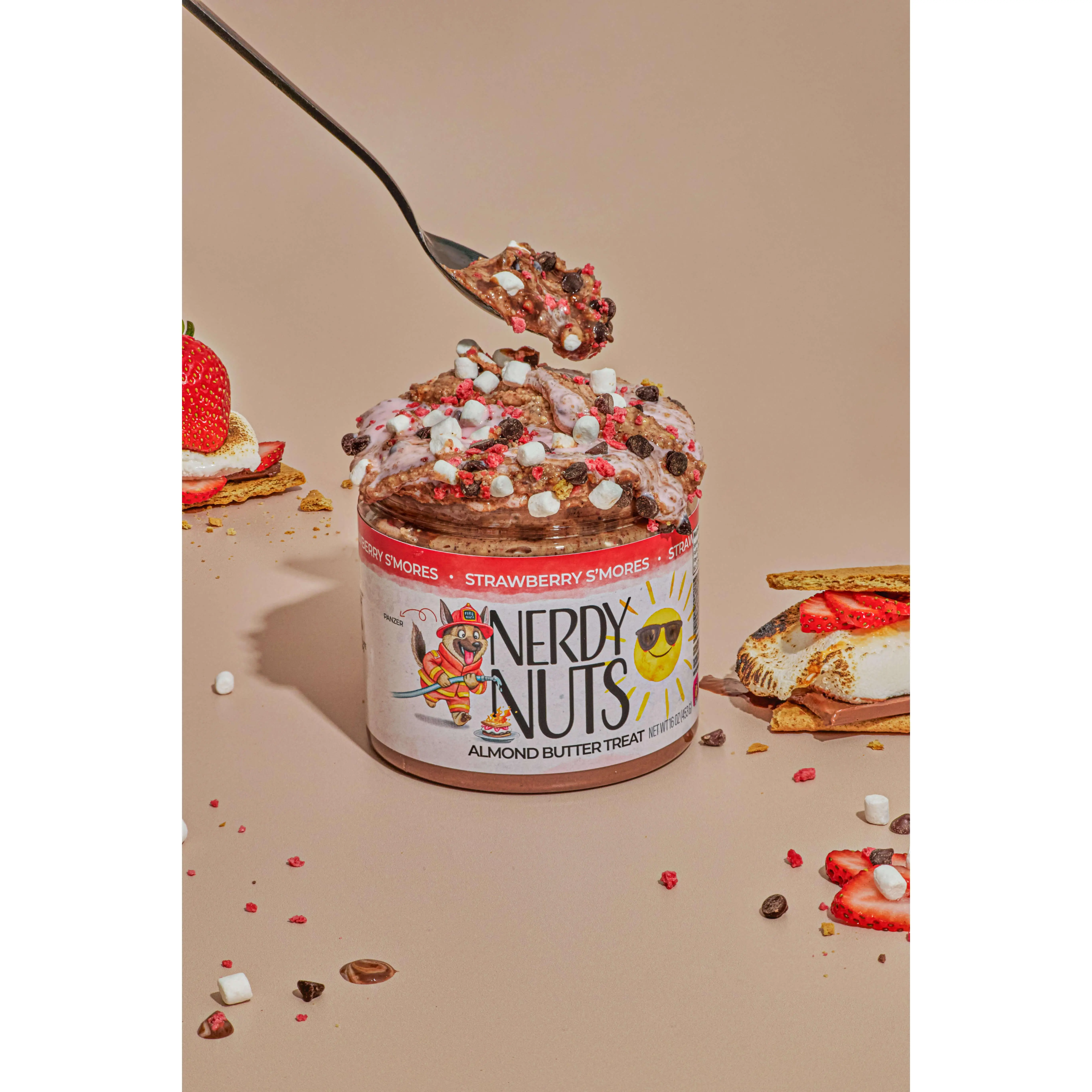 Strawberry white chocolate almond butter is layered on chocolate graham sauce, topped with strawberry mallow creme, strawberry crunchies, dehydrated mallow bits, and chocolate chips!
