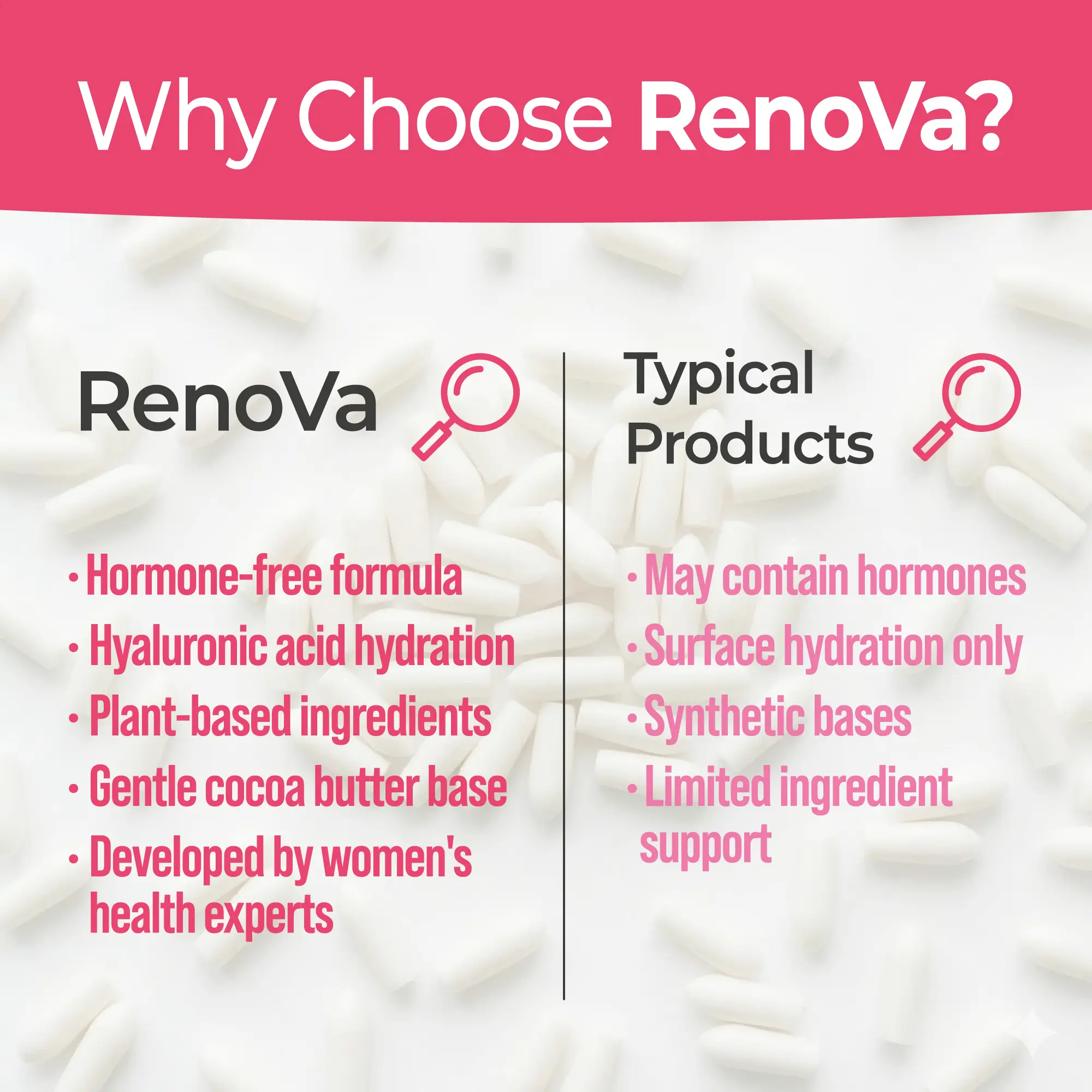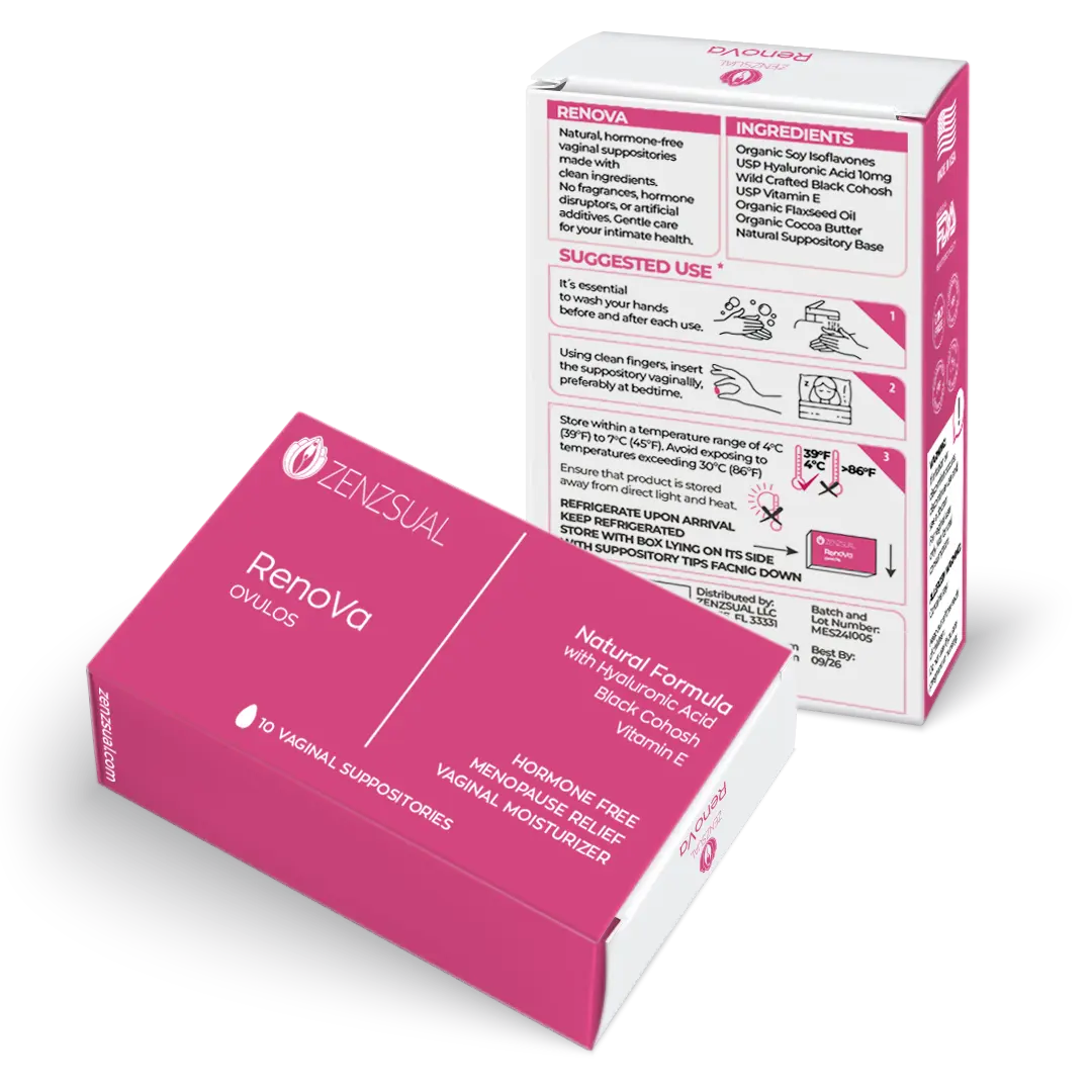 Renova is a hormone-free intimate care ovule designed to support vaginal moisture, comfort and tissue softness as part of a daily wellness routine.