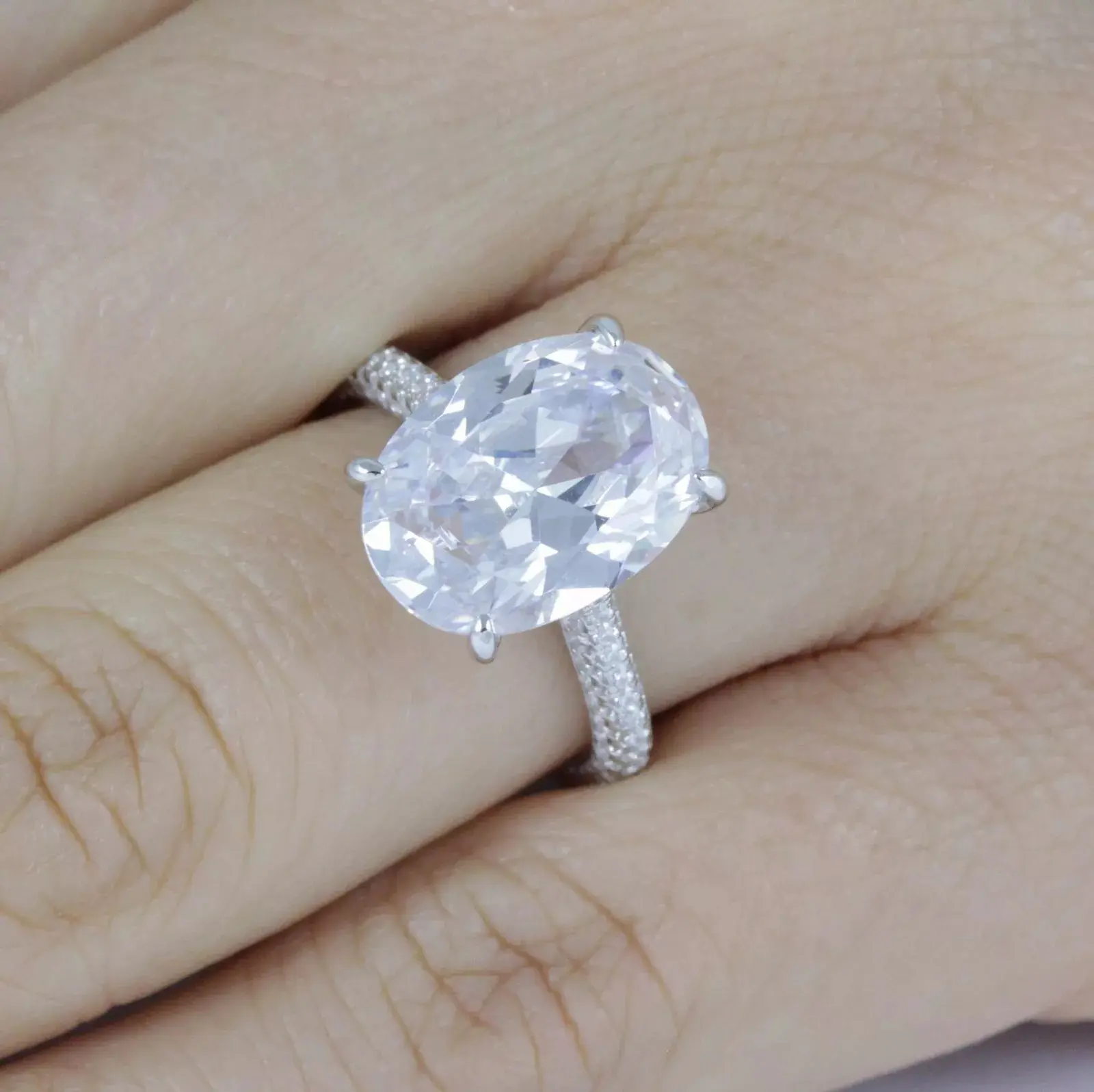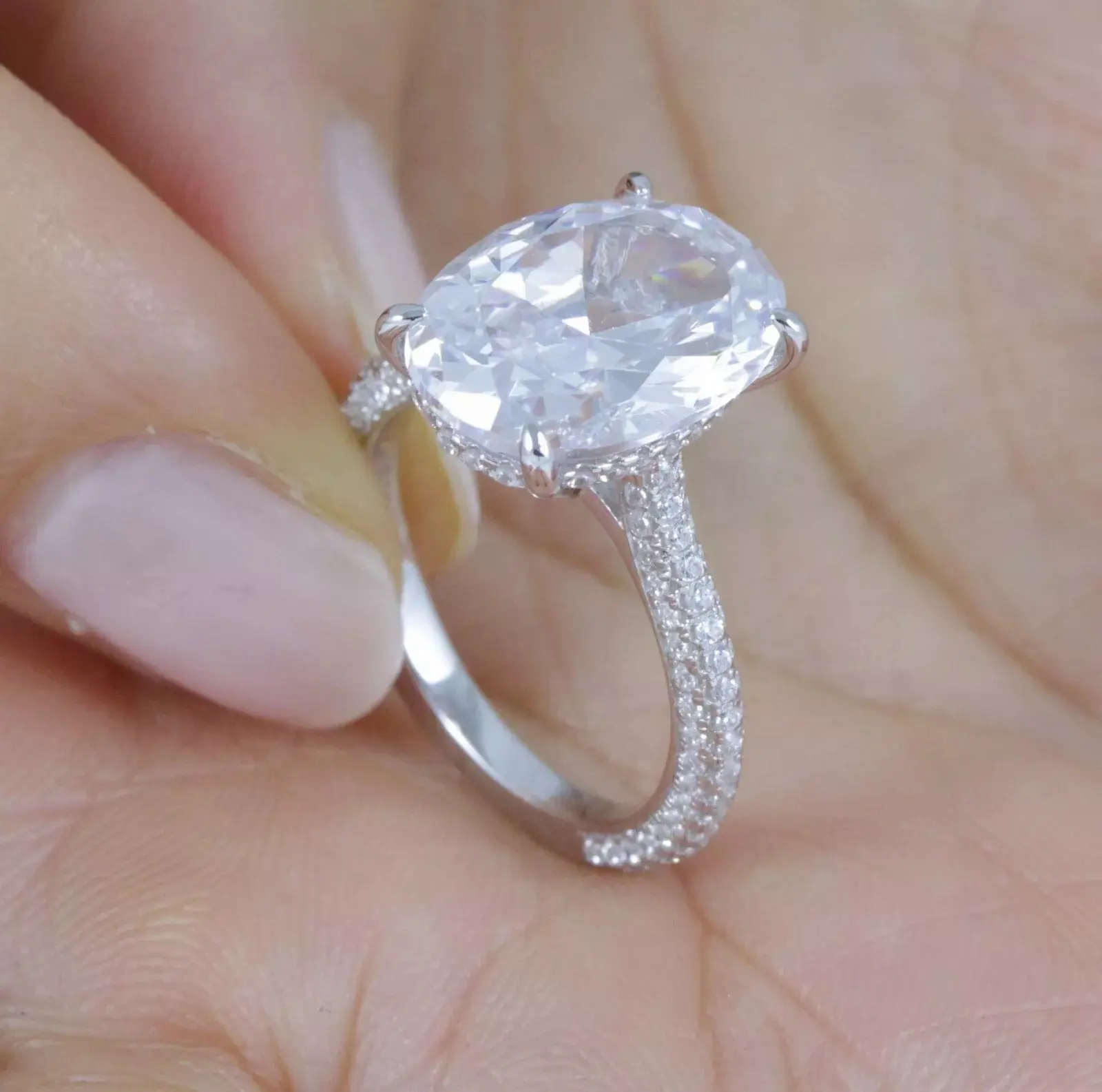 You are looking at gorgeous fancy oval cut women's CZ .925 sterling silver engagement/wedding/fashion ring. This ring features a 10mm x 14mm (5.8 carats) brilliant oval cut center stone, and 32pcs 0.8mm, 56pcs 1.1mm, 30pcs 1.3mm round cut accent stones. Top quality AAA Cubic Zirconia display amazing enriched clarity just like real diamonds! Total carat weight is approx. 6.5 carats diamond equivalent. Set in .925 sterling silver (stamped) and finished with rhodium plating for maximum shine and protection (platinum look).