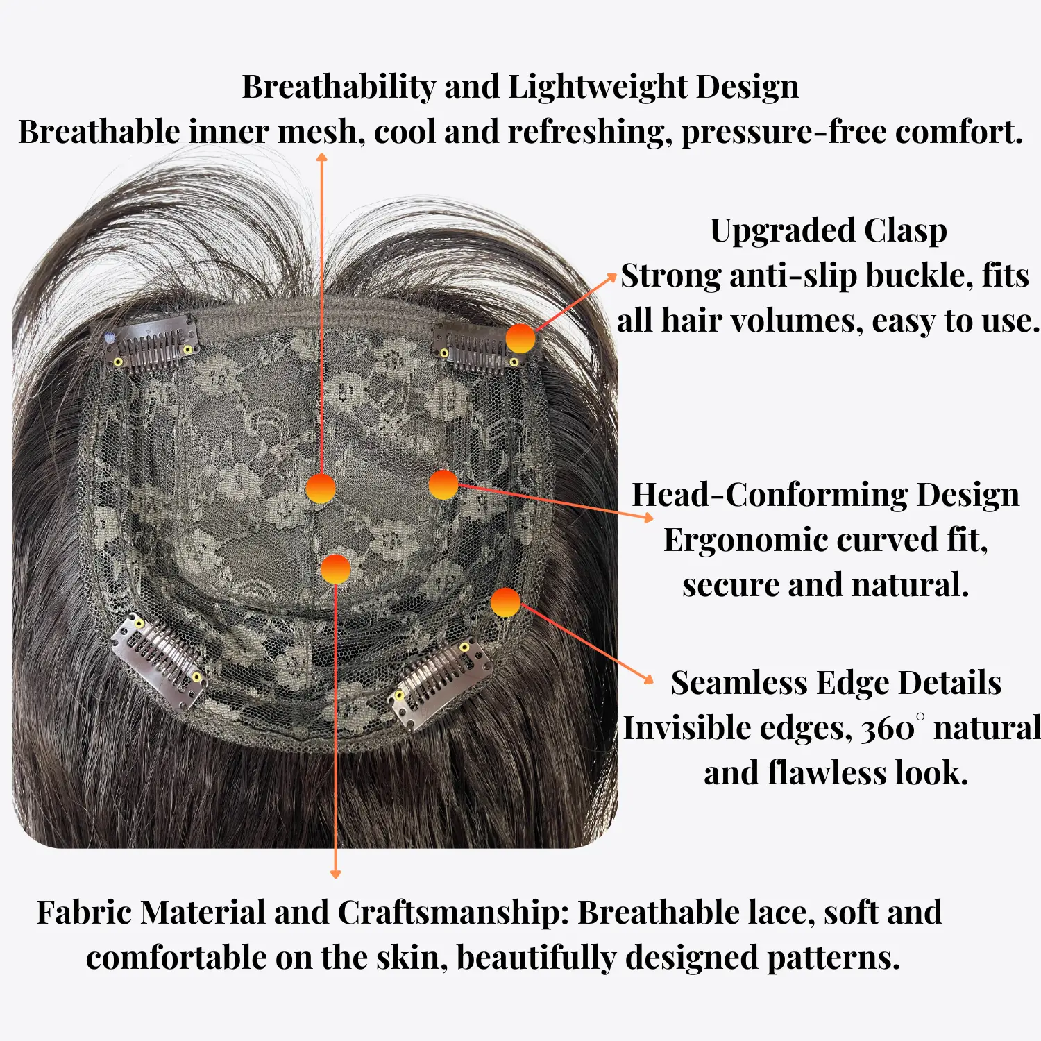 ·Universal Fit and Comfort: Unlike full wigs, Hair Toppers rest lightly on your crown, adapting to any head shape for unmatched comfort.