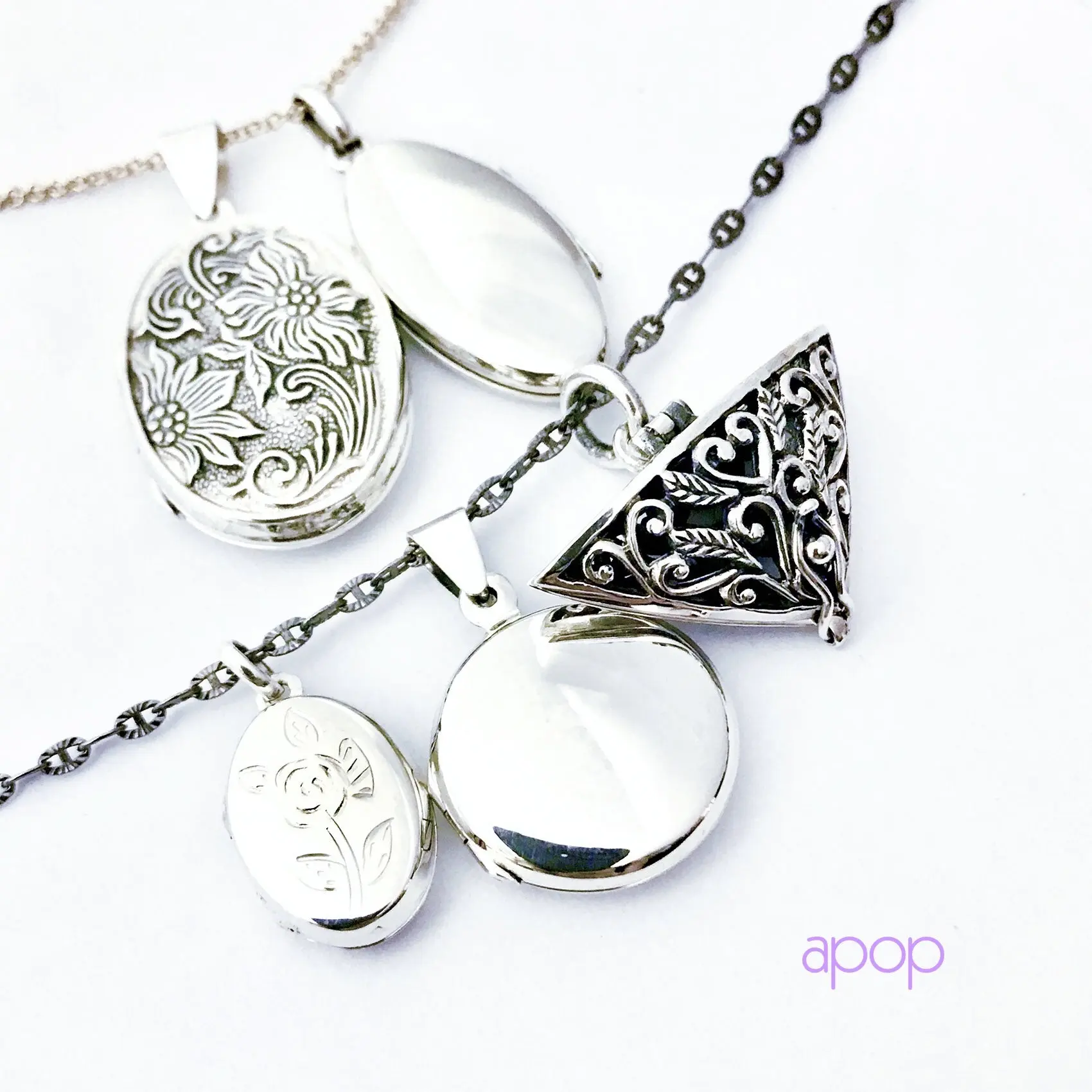 Made of .925 sterling silver. Mini round locket with etched accent on both sides. Silver locket opens and stores two mini photos. Choose your chain length.