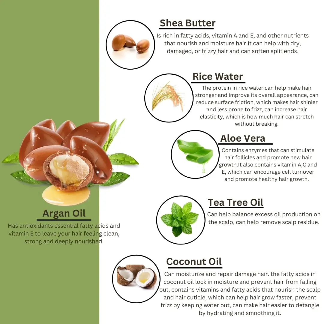 ·Rice Water has proteins to promotes strong hair and protects against breakage, super moisturizing and volumizing formula with beneficial ingredients such as Argan Oil, Tea Tree Oil, Coconut Oil for visibly thicker and healthier hair.