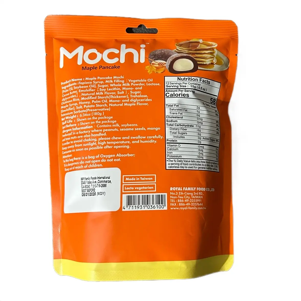 In conclusion, the Royal Family Mochi Maple Pancake is a sweet snack dessert that is perfect for those who love a sweet and savory combination. The product is made of rice cake, which is a nutritious and healthy snack that is easy to digest and has a low glycemic index. The rice cake is filled with a delicious maple butter filling that is sweet and savory, making it a perfect combination for those who love a sweet snack dessert. The product is 180g in weight, making it a perfect size for a many servings.