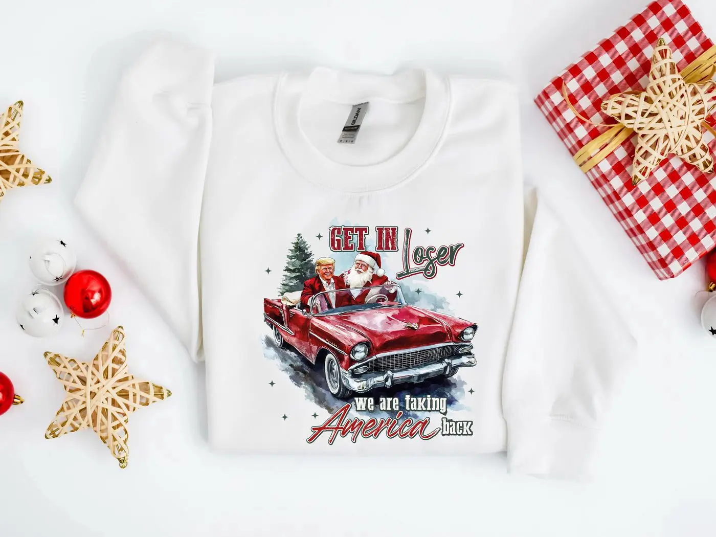 5. Trump Get In Loser We Are Taking America Back Sweatshirt, Humorous Trump Christmas Shirt