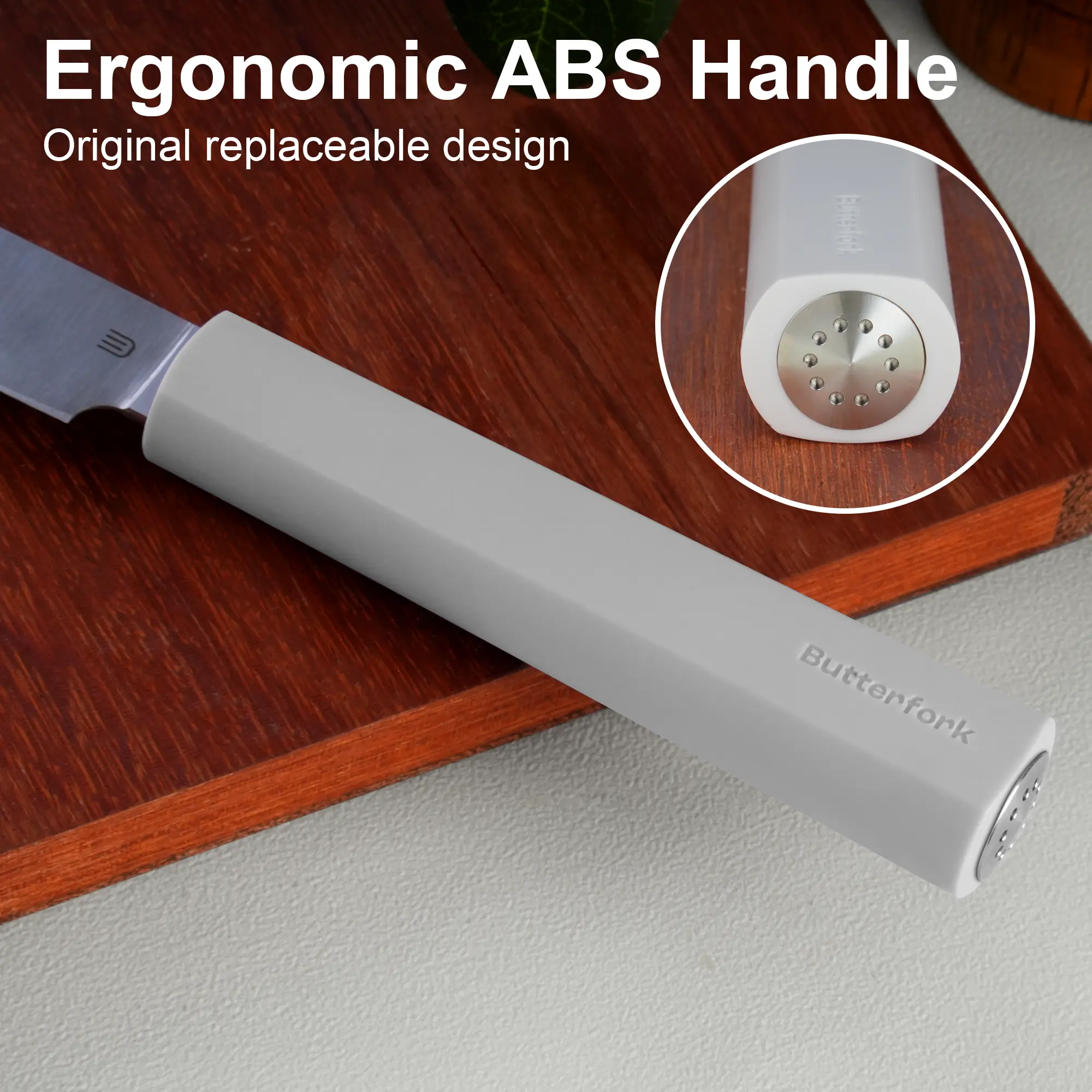 At the same time, Considering the modern kitchen's aesthetic and individual preferences for color, we have introduced a design with interchangeable knife handles. Currently, we offer six ABS handle options. We will continue to expand our selection with different materials and colors to complement the styles of our users' home kitchens.