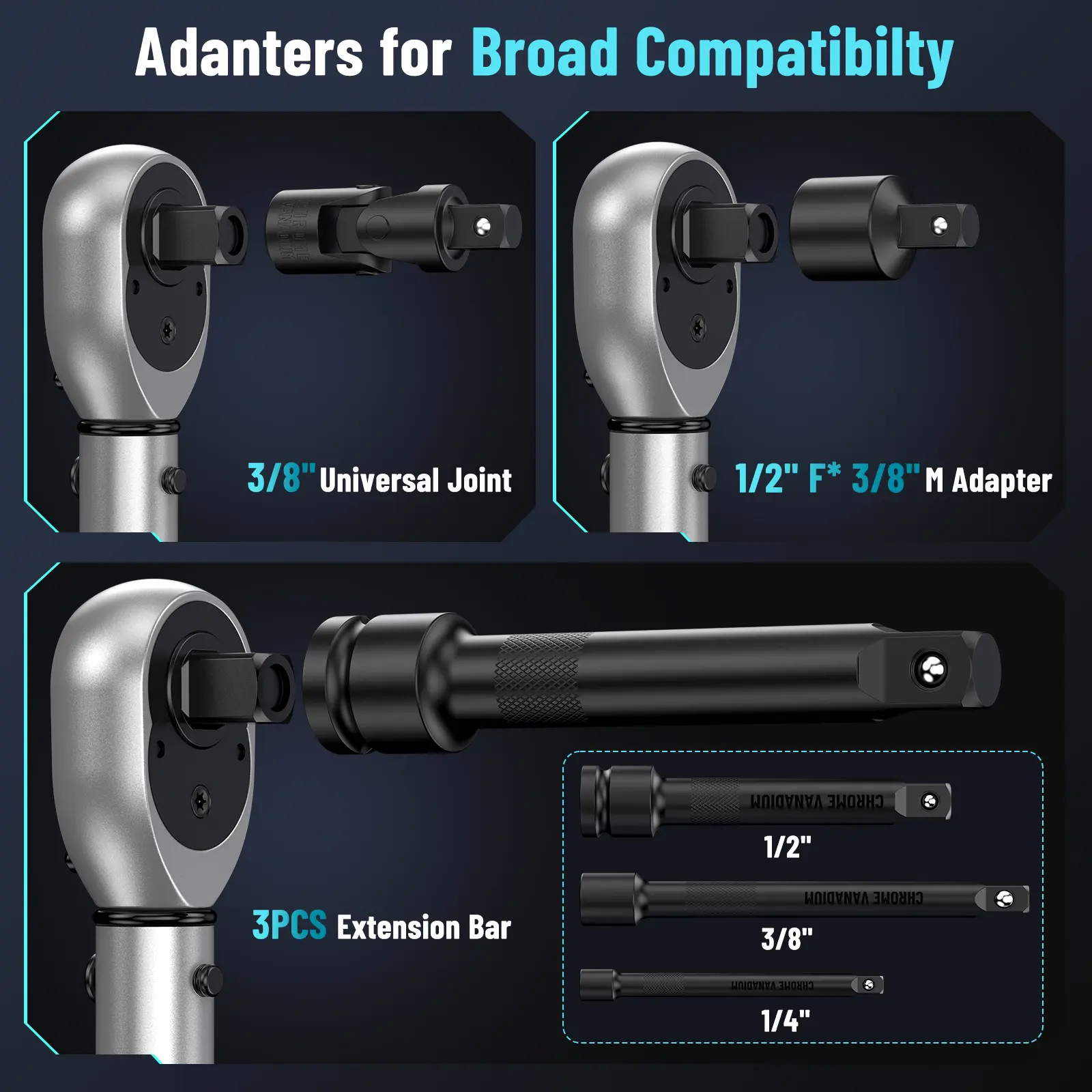 The ratchet head of our torque wrench is crafted from hardened and treated Cr-Mo Steel, renowned for its outstanding durability and resistance to wear and tear. The handle is meticulously constructed from high-grade aerospace aluminum, endowing it with remarkable durability and excellent corrosion resistance. All the adapters are treated with phosphating, which further augments their wear resistance and extends their service life. This combination of top-notch materials and advanced treatment processes ensures that our torque wrench set can withstand the rigors of heavy use and provide reliable performance over an extended period.