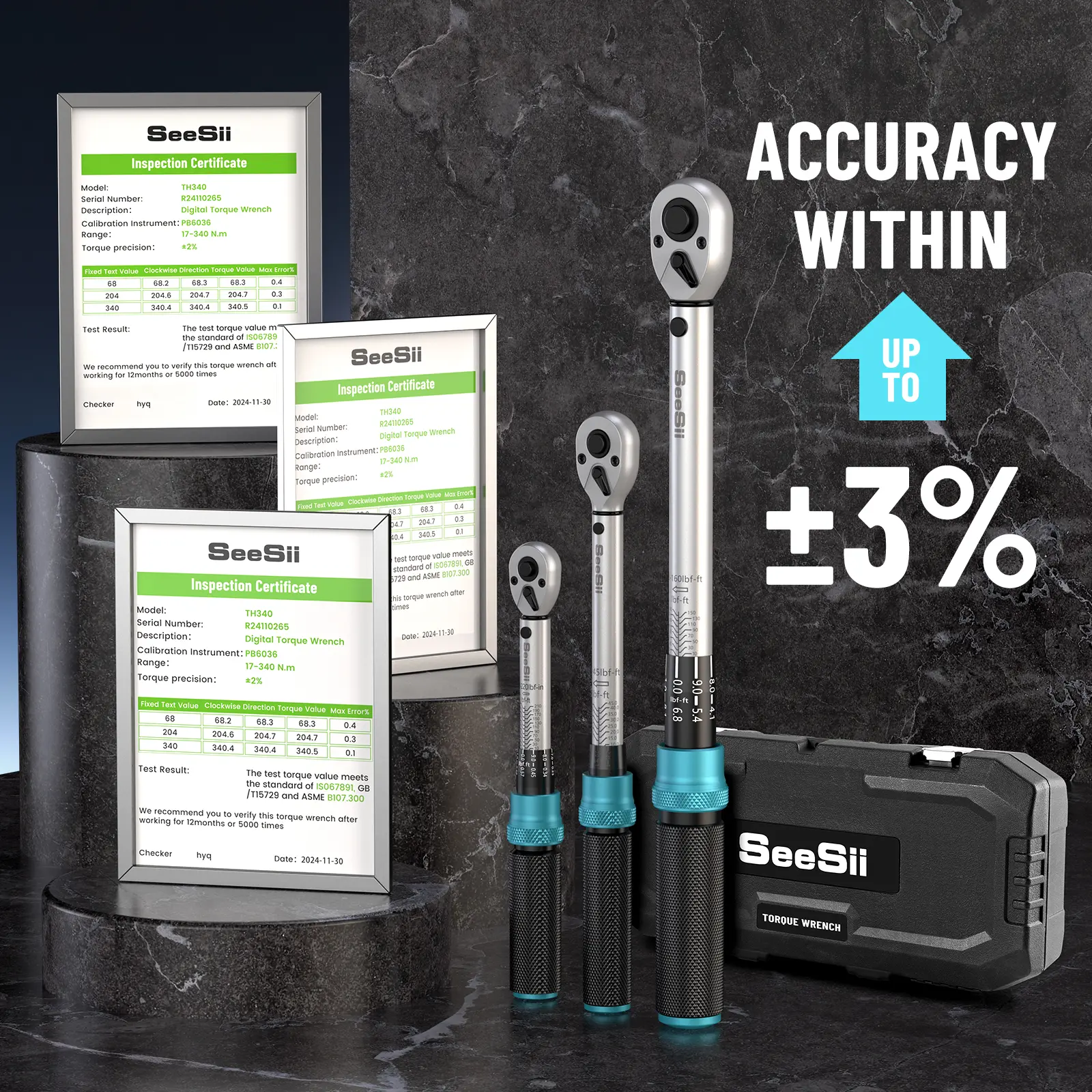 The 1/4 inch torque wrench offers a remarkable range of 45 - 221 in.lb or 5 - 25 Nm with a precise 1 in.lb micro-adjustment. The 3/8 inch one spans from 7 - 45 ft.lb or 10 - 60 Nm with a 0.25 ft.lb micro-adjustment. And the 1/2 inch wrench has a range of 30 - 160 ft.lb or 40 - 210 Nm with a 1 ft.lb micro-adjustment. Each and every torque wrench in this set undergoes rigorous and specialized instrument testing prior to leaving the factory. This strict quality control process guarantees an accuracy level within ±3%, and each wrench is accompanied by a formal calibration certificate, providing you with the utmost confidence in its precision.