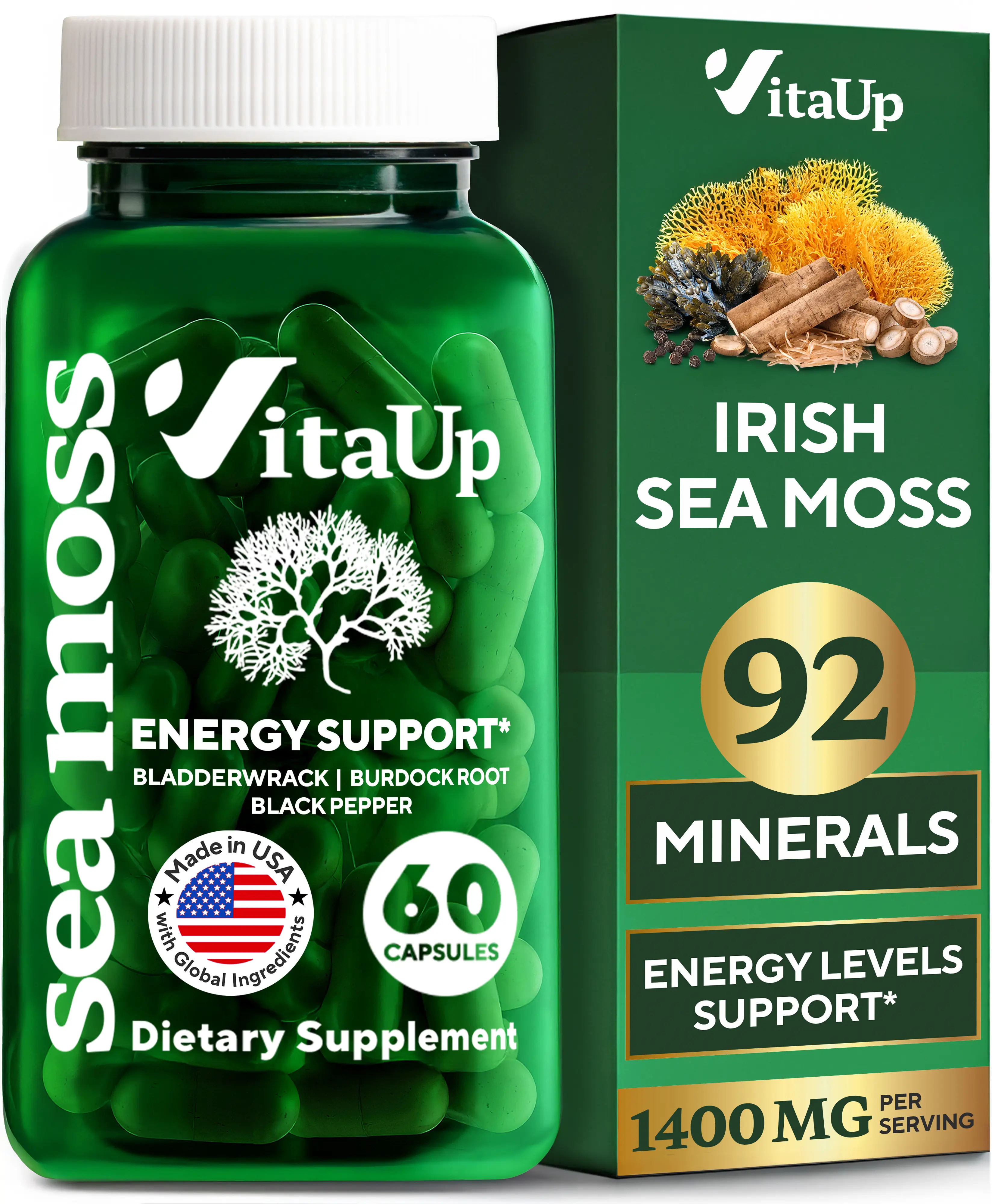 ·All-IN-ONE SUPPLEMENT: Forget about dozens of ineffective supplements. VitaUp irish sea moss capsules contain 92 nutrients, including zinc, iron, calcium, potassium, silica, and B-complex vitamins. This makes our sea moss pills a perfect addition to your routine.*