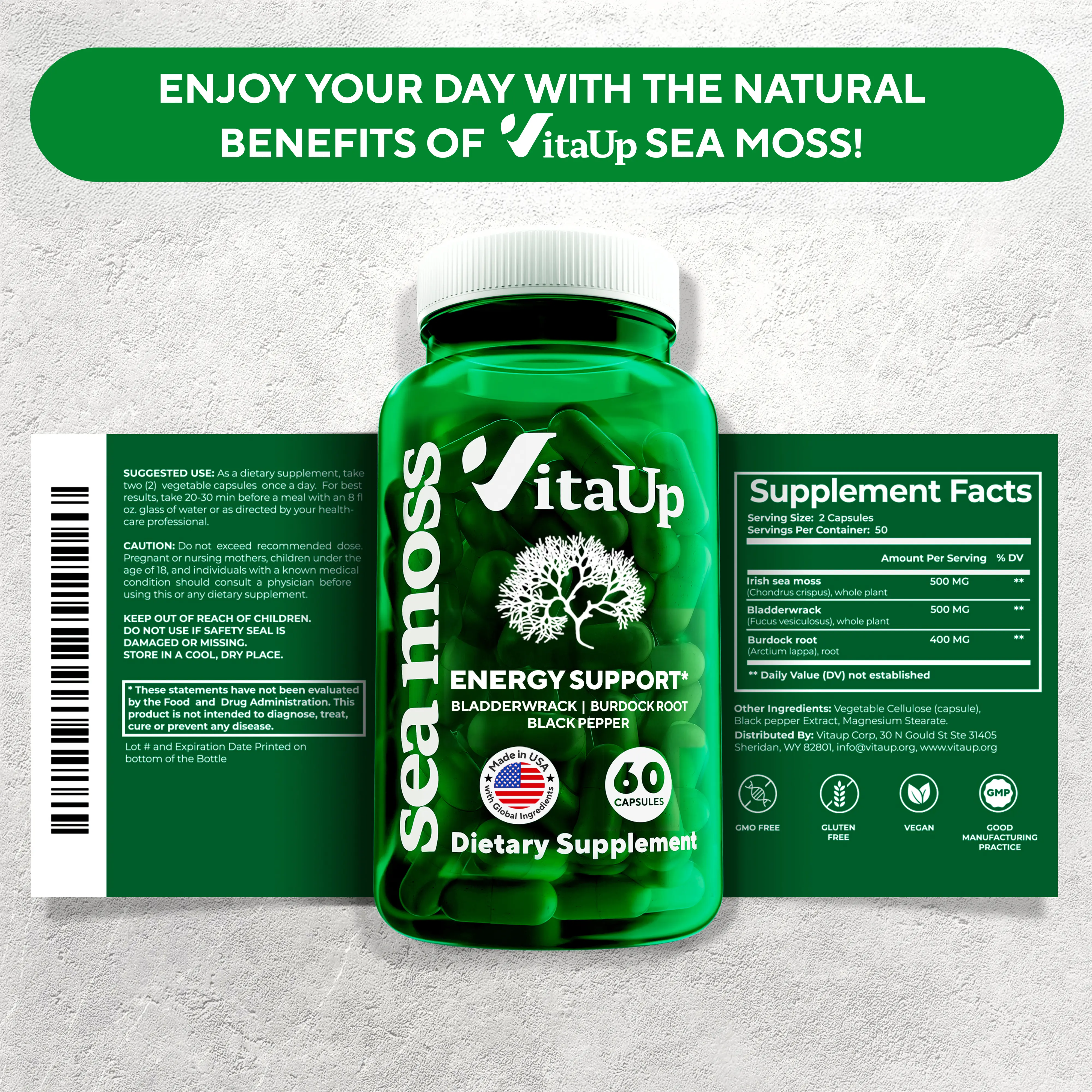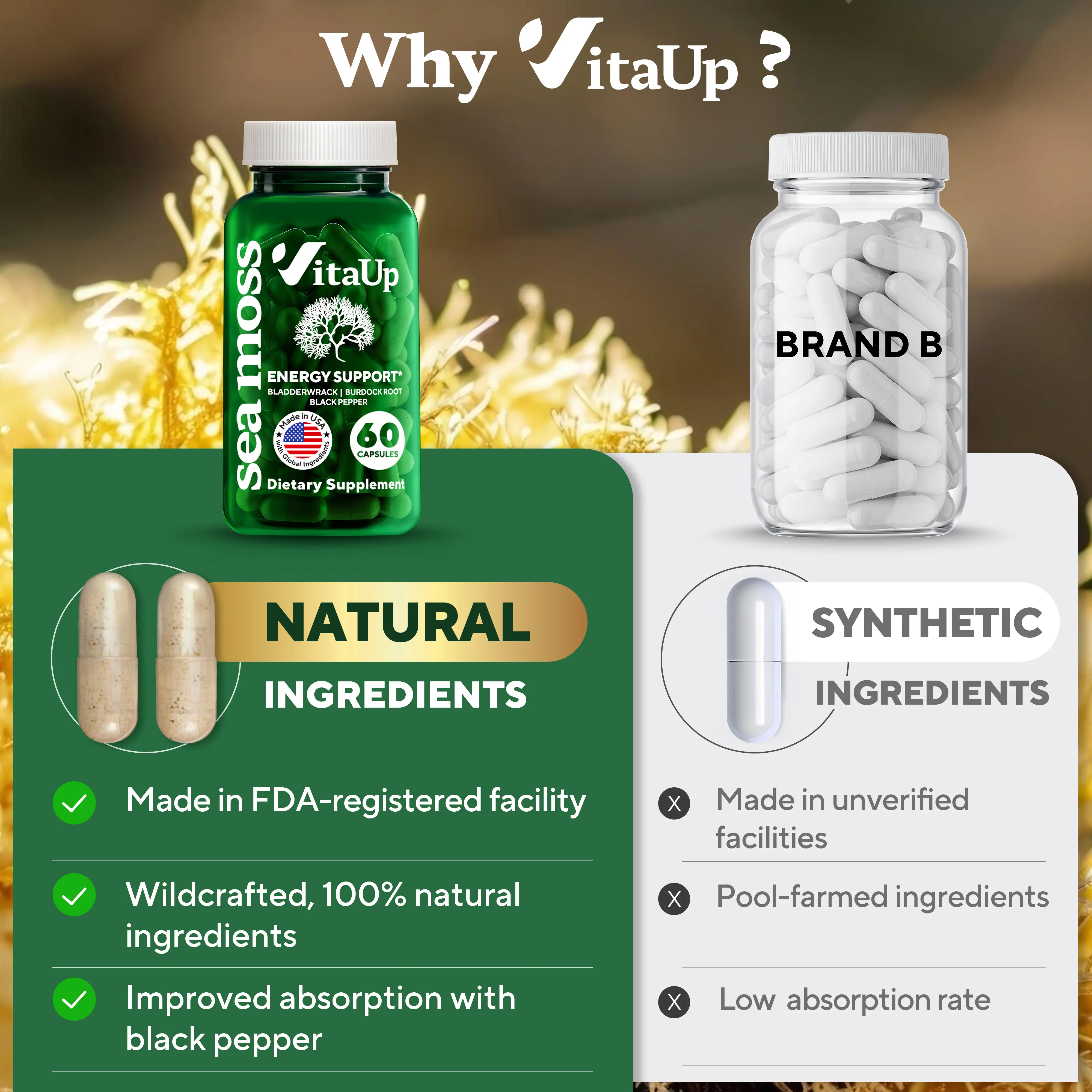 ·100% NATURAL INGREDIENTS: Unlike other brands, VitaUp offers its customers only natural ingredients of the highest quality. Enriched with black pepper extract, our wildcrafted sea moss capsules demonstrate increased absorption compared to sea moss gel and sea moss gummies.*