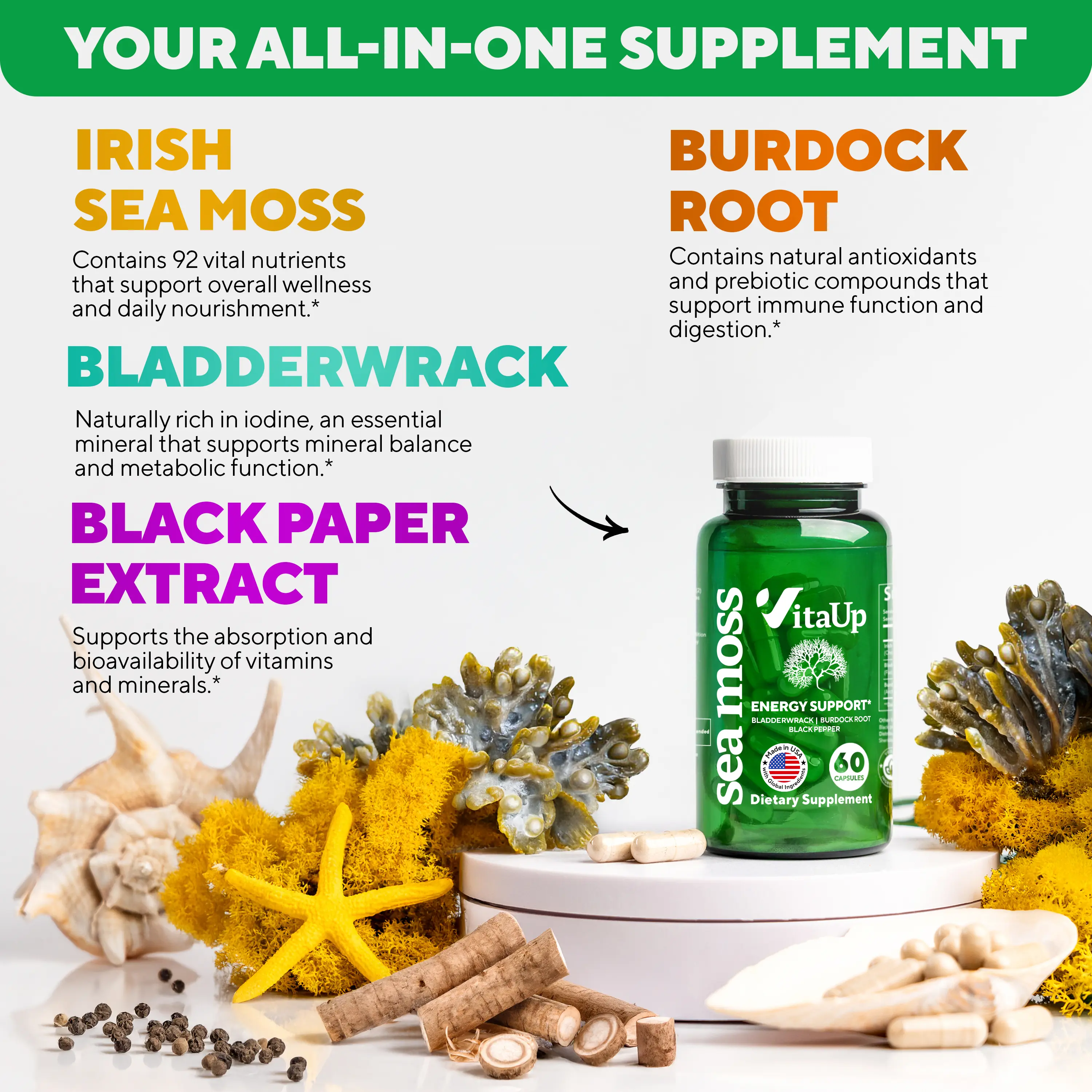 ·ENERGY & IMMUNE SUPPORT: VitaUp seamoss bladderwrack burdock capsules are rich in antioxidants, which help strengthen immunity and increase energy production. Our irish sea moss powder also contains inulin, a prebiotic that supports the digestive system.*