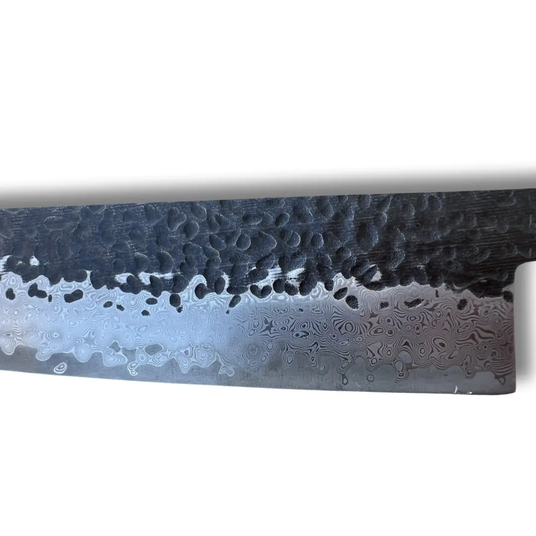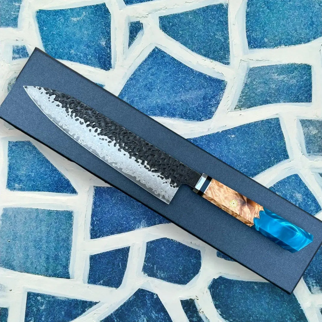 At the intersection of art and culinary excellence is our 8-inch Gyuto Hammer Finish Chef Knife. This knife features a striking hammered finish on the blade, combining both artistry and functionality for precise cutting. The handle, a fusion of blue resin and premium wood grain, not only offers a comfortable grip but also adds a touch of elegance to your kitchen. Elevate your cooking experience with this exquisite, high-quality chef's knife, designed for both professional chefs and cooking enthusiasts alike.