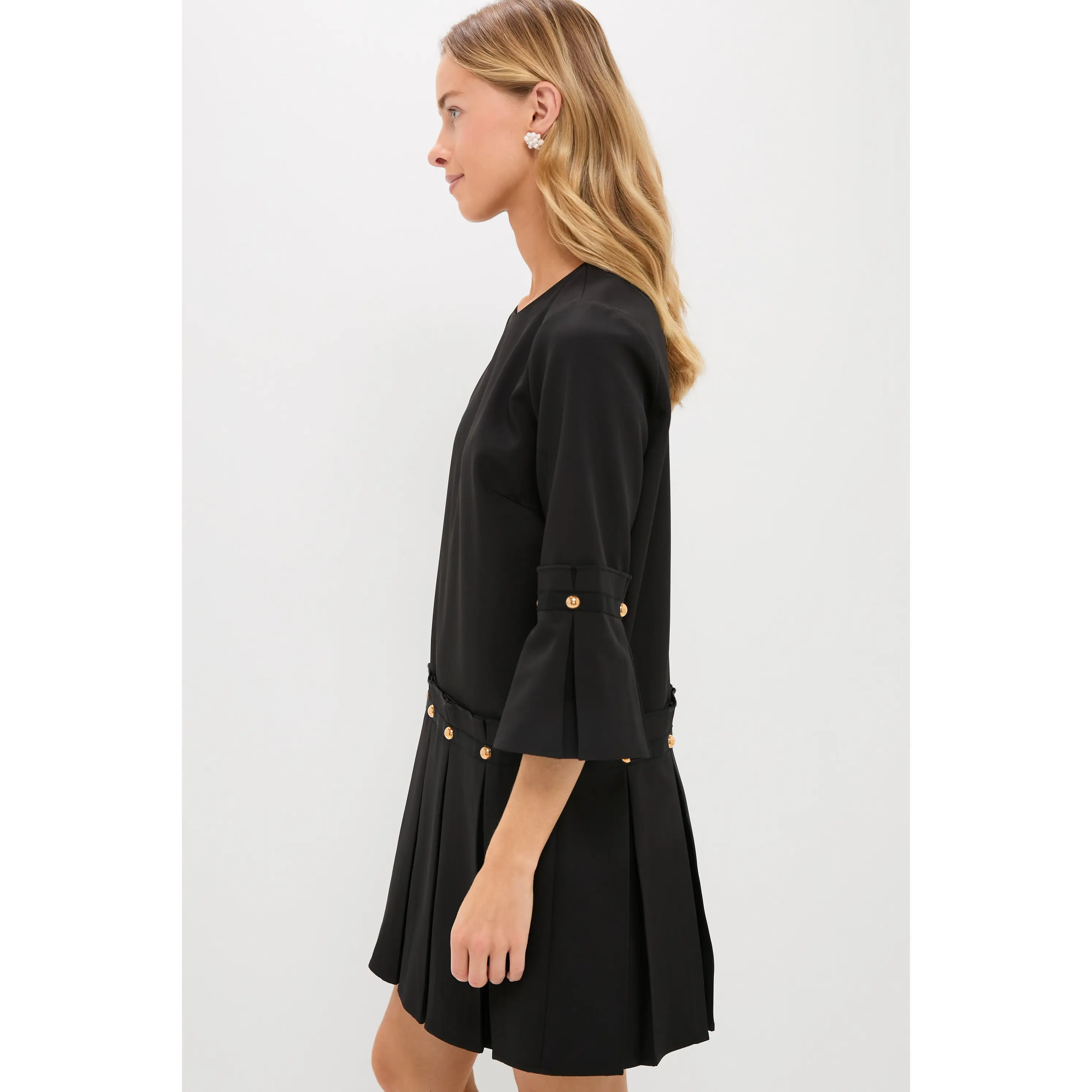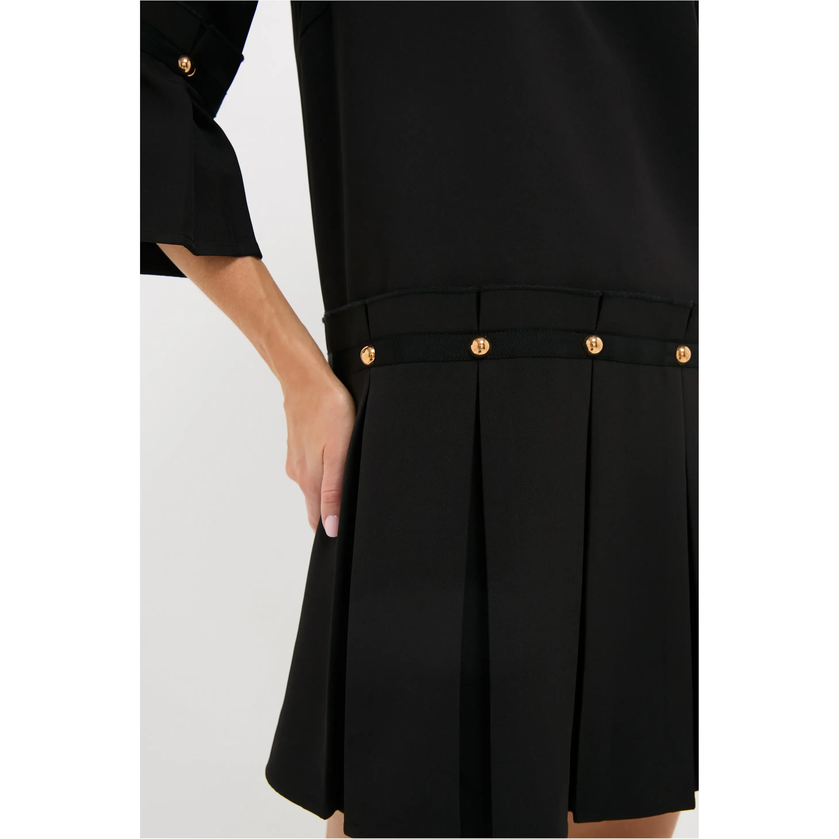 The Kennedy Dress is the type of style that can seamlessly take you from desk to drinks. With pleats along the cuffs and skirt and gold studded detailing, this chic LBD will pair perfectly with tights and heels, ballet flats, and boots!