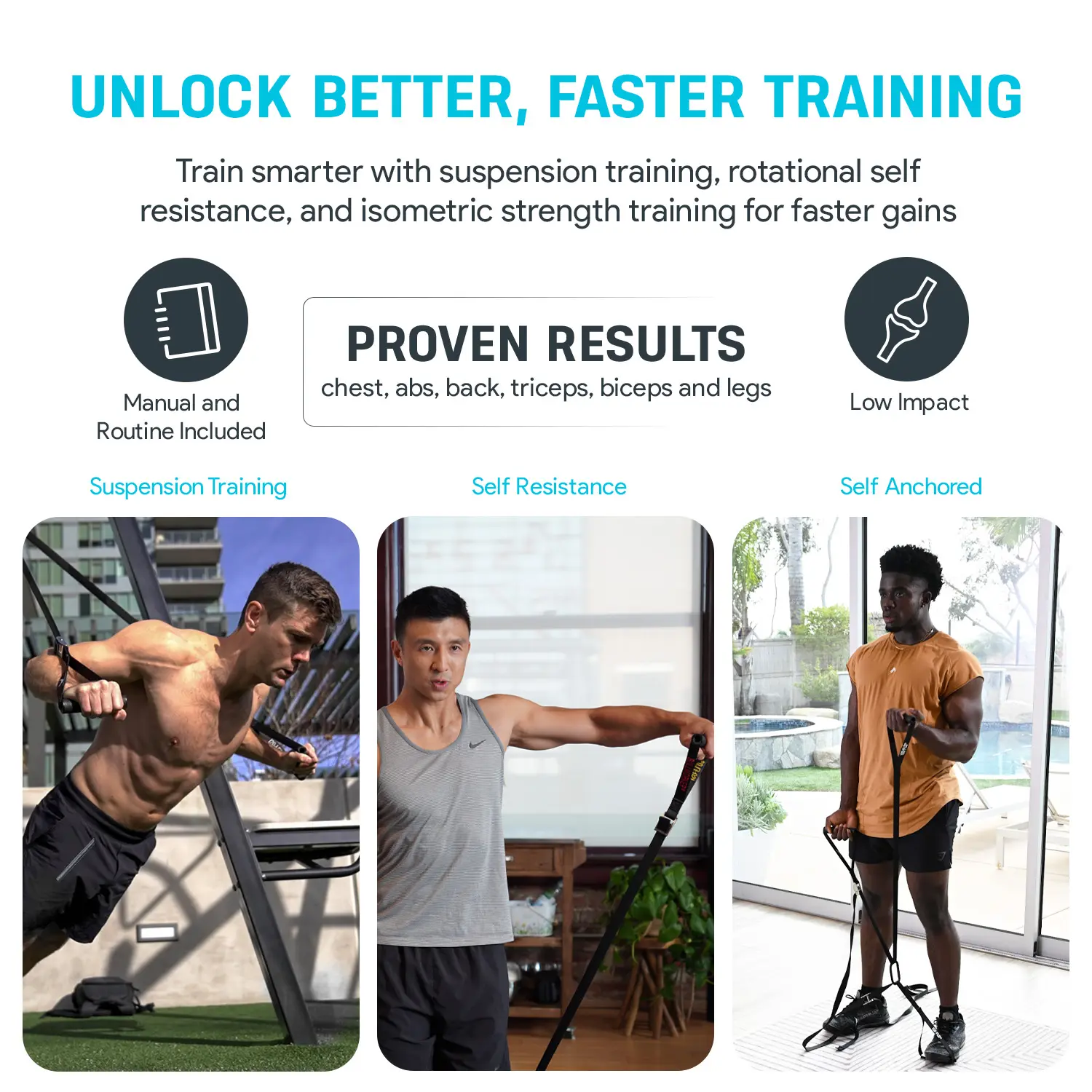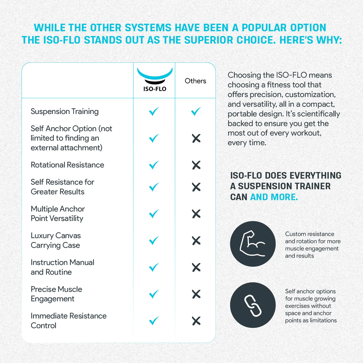 The ISO-FLO resistance bands with handles use time under tension (TUT) and rotational movements to enhance strength, mobility, and muscle definition. They are self-resistance workout bands that adapt to your needs, offering a customizable and scalable workout experience for all. Follow the included exercise guides to target each muscle group effectively. The ISO-FLO suspension straps are a great piece of: