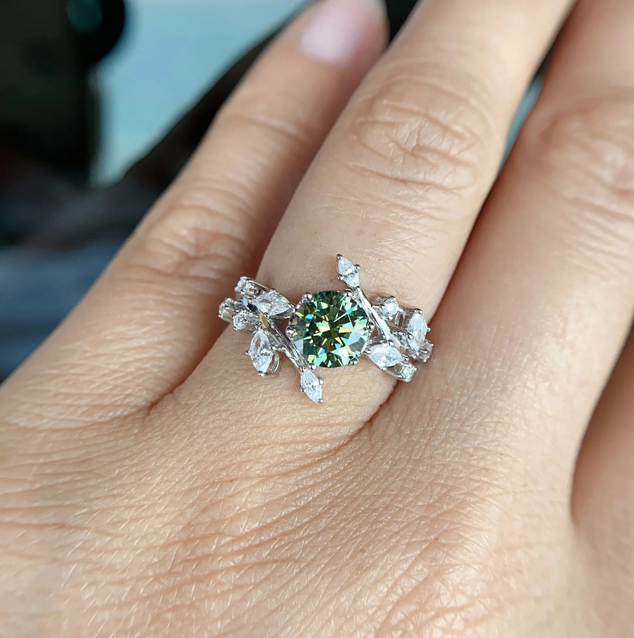 This is gorgeous green round cut moissanite and CZ engagement/wedding/fashion ring. The ring features a 6.5mm (1 carat) green round vvs1 excellent cut moissanite center stone, and 13pcs CZ accent stones, prong set in .925 sterling silver (stamped) and finished with rhodium plating for maximum shine and protection (platinum look). Total carat weight is about 1.3 carats.