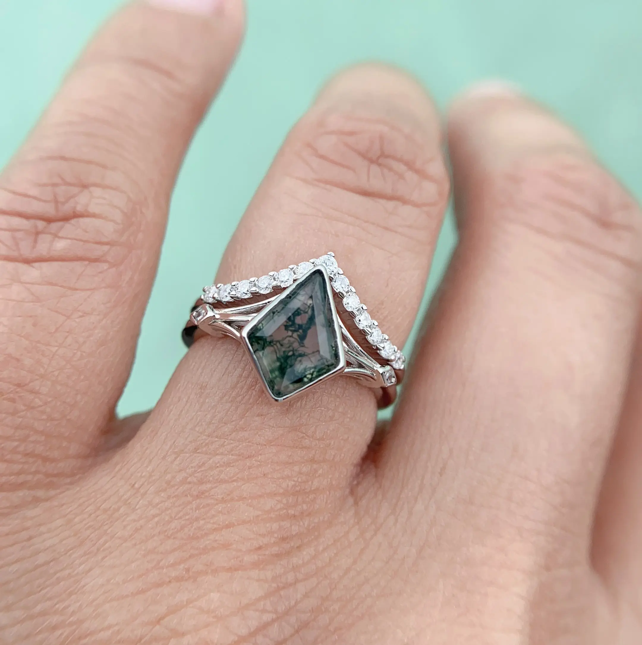 This is stunning genuine natural moss agate engagement ring and wedding band 2pcs bridal ring set. The engagement ring features a 10*7mm kite shape main stone and 2 round cut accent CZ stones. Matching band has 13pcs round cut CZ stones. Set in .925 sterling silver (stamped 925) and finished with platinum plating for maximums shine and protection.