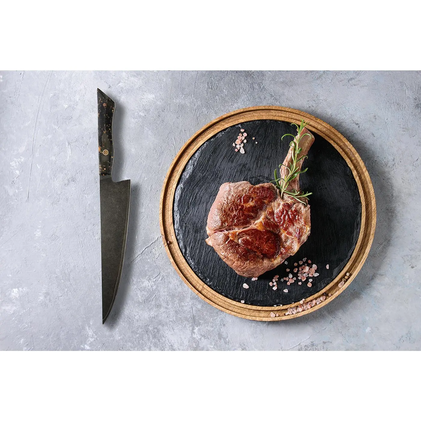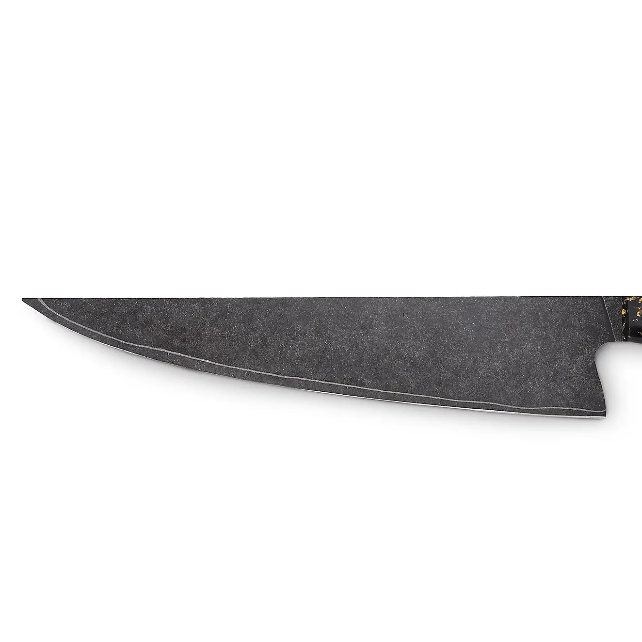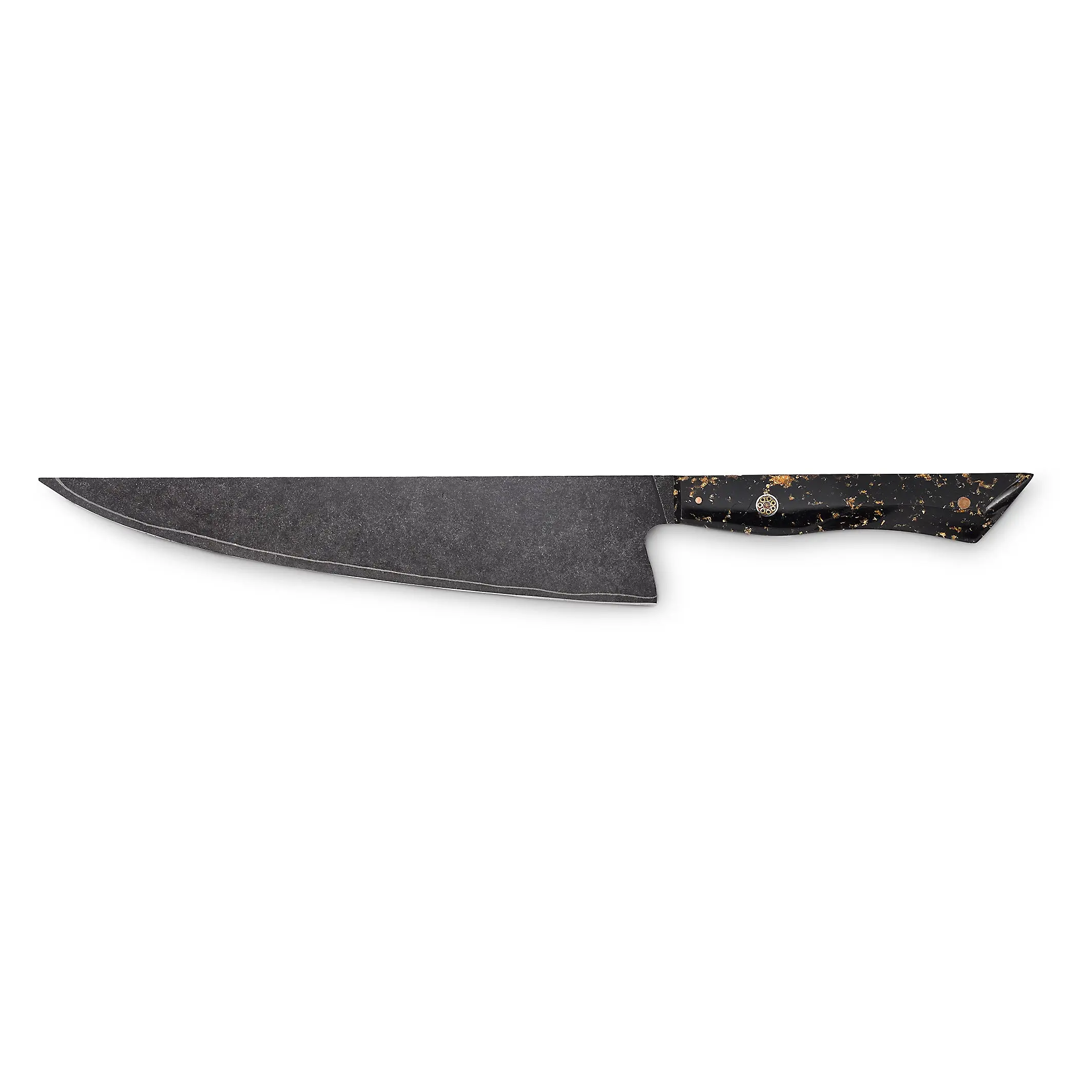 Introducing our Kurai Black Carbon Chef Knife - a sleek essential for culinary perfection. The black blade, crafted from carbon steel, ensures exceptional cutting precision. Its black handle, elegantly accented with gold, not only provides a comfortable grip but also adds a touch of sophistication to your kitchen. Elevate your cooking experience with this striking and high-quality chef's knife that combines functionality with a touch of luxury.