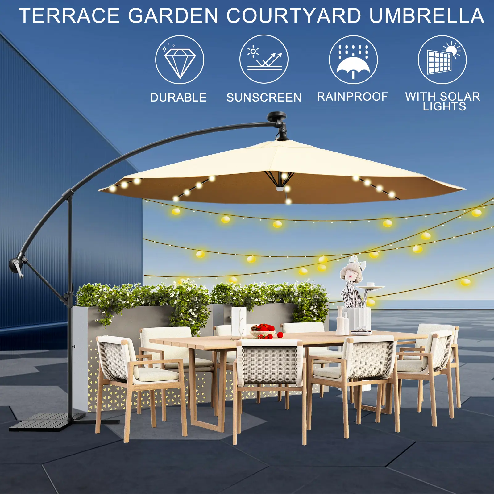 8.9x8.9ft 2-Tier Square Cantilever Patio Umbrella, Outdoor Umbrella with Solar LED Lights, Outdoor Sun Shade Hand-cranked Umbrella for Backyard
