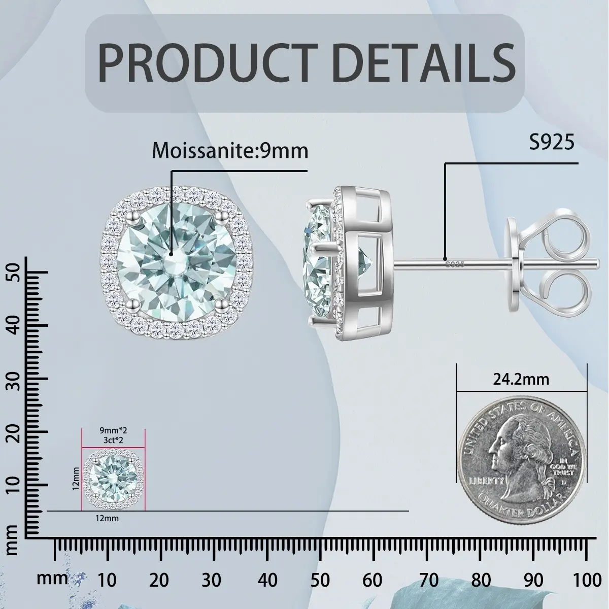 12MM: Center Stone 9mm(3ct*2)/Side Stone 1.3mm*48(0.48ct), Total: 6.48ct
