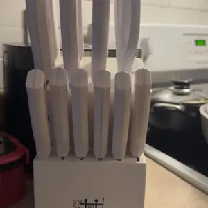 Very disappointed. We waited a long time for this knife set, but the stand has a dent/bubble and a crack. The box also arrived damaged. We never used it only opened and saw the defects. This looks like a manufacturing issue and poor inspection before shipping.