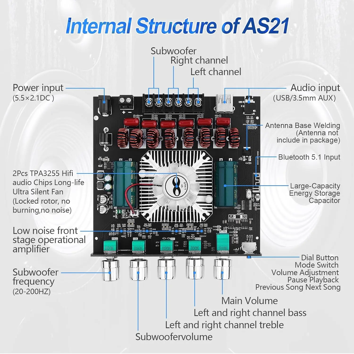 ·【2.1 CH Subwoofer Audio Amplifier Board】 This AS-21 power amplifier is 2.1channel, allows you to connect 2 passive speakers and drive a subwoofer, comes with Treble and Bass buttons, independent subwoofer volume adjustment buttons and 20-200Hz subwoofer frequency adjustment buttons, which is very friendly for audiophiles, you can adjust the Treble and Bass buttons, make the bass more shocking and the treble clearer, make the sound more layered