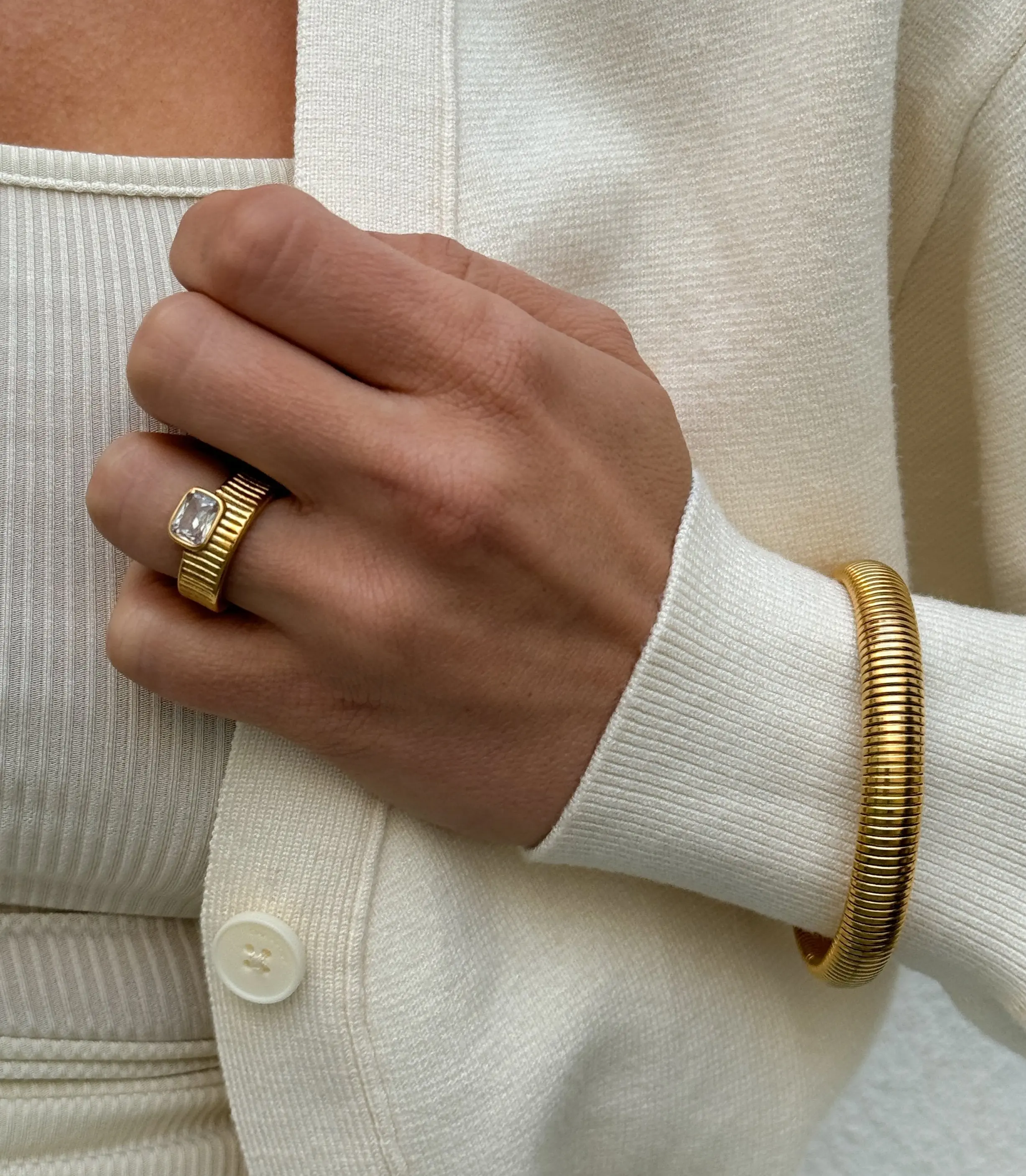 Gold Cigar Band Ring with Crystal Stone