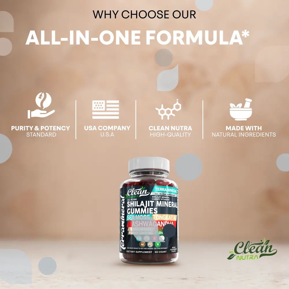 Elevate your health with our Shilajit Gummies, packed with a potent mix of natural ingredients. Vegan Formula: Crafted without animal products, ensuring a guilt-free indulgence. Nutrient-Rich Ingredients: Infused with Sea Moss, Tongkat Ali, Ashwagandha, Lions Mane, Maca, and Rhodiola for comprehensive support. Tasty and Convenient: Delight in the benefits of vitamins in a gummy form. Perfect for those seeking a unique way to nourish their body!