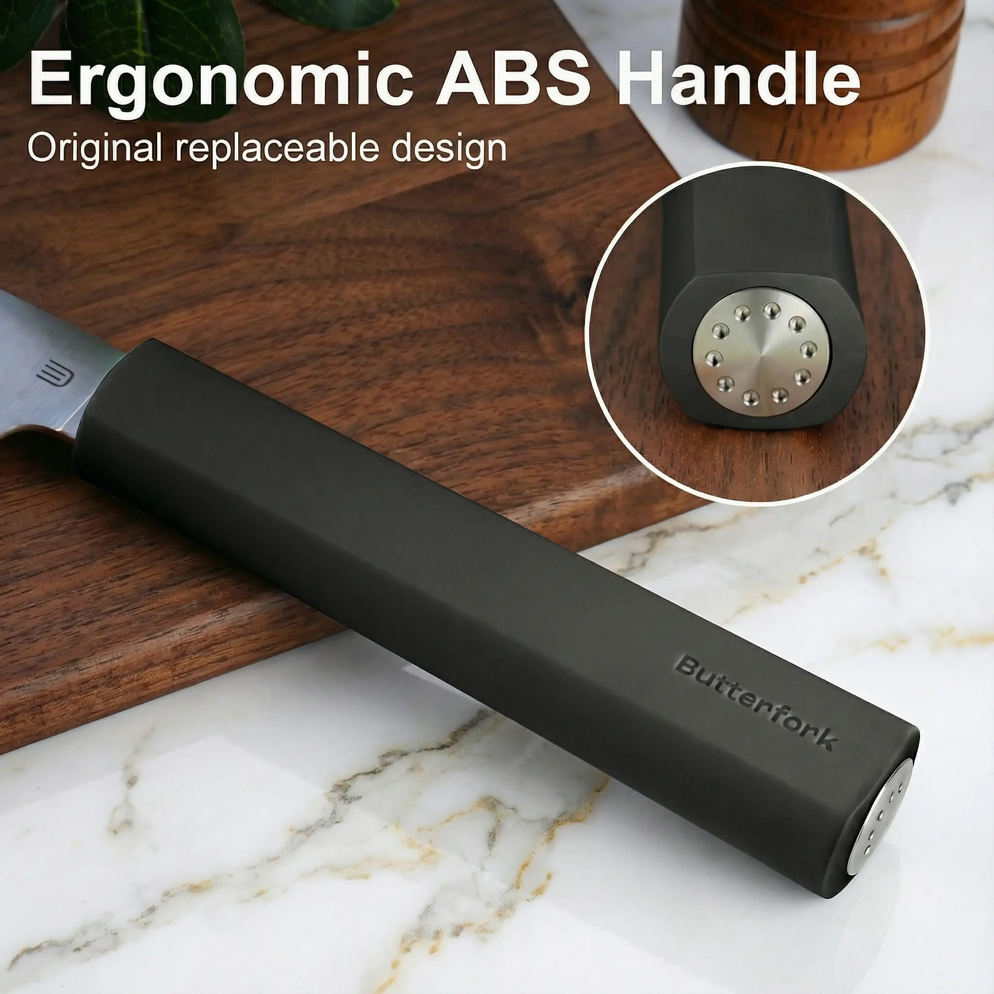 At the same time, Considering the modern kitchen's aesthetic and individual preferences for color, we have introduced a design with interchangeable knife handles. Currently, we offer six ABS handle options. We will continue to expand our selection with different materials and colors to complement the styles of our users' home kitchens.