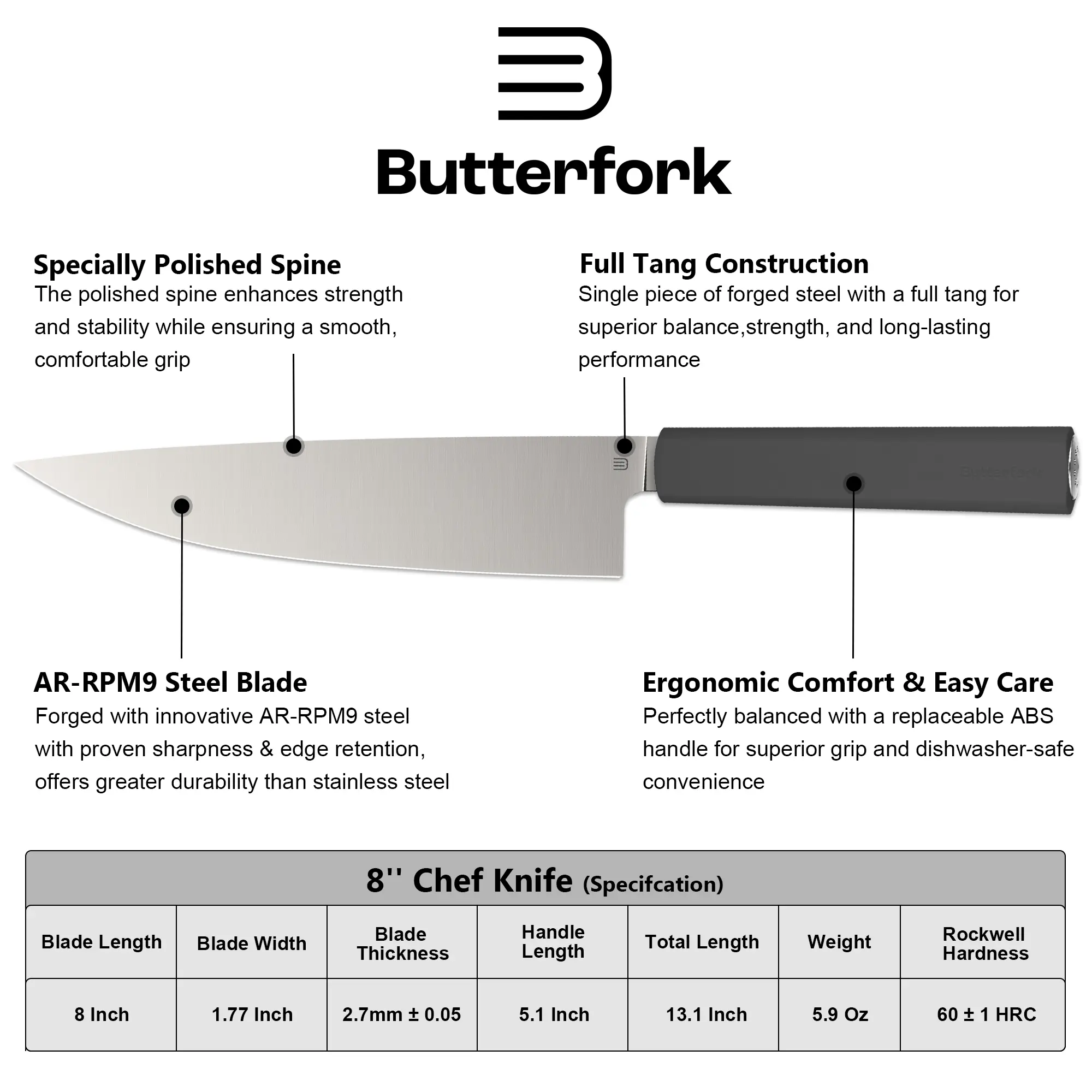 ·The Purest Chef's Knife is forged from AR-RPM9 Steel, offering a great balance of sharpedge retention and durability. This blade is designed to be sharper from the start and stays razor-sharp after 1,200+ cuts, outlasting ordinary blades by 2x – no more frequent sharpening hassles.