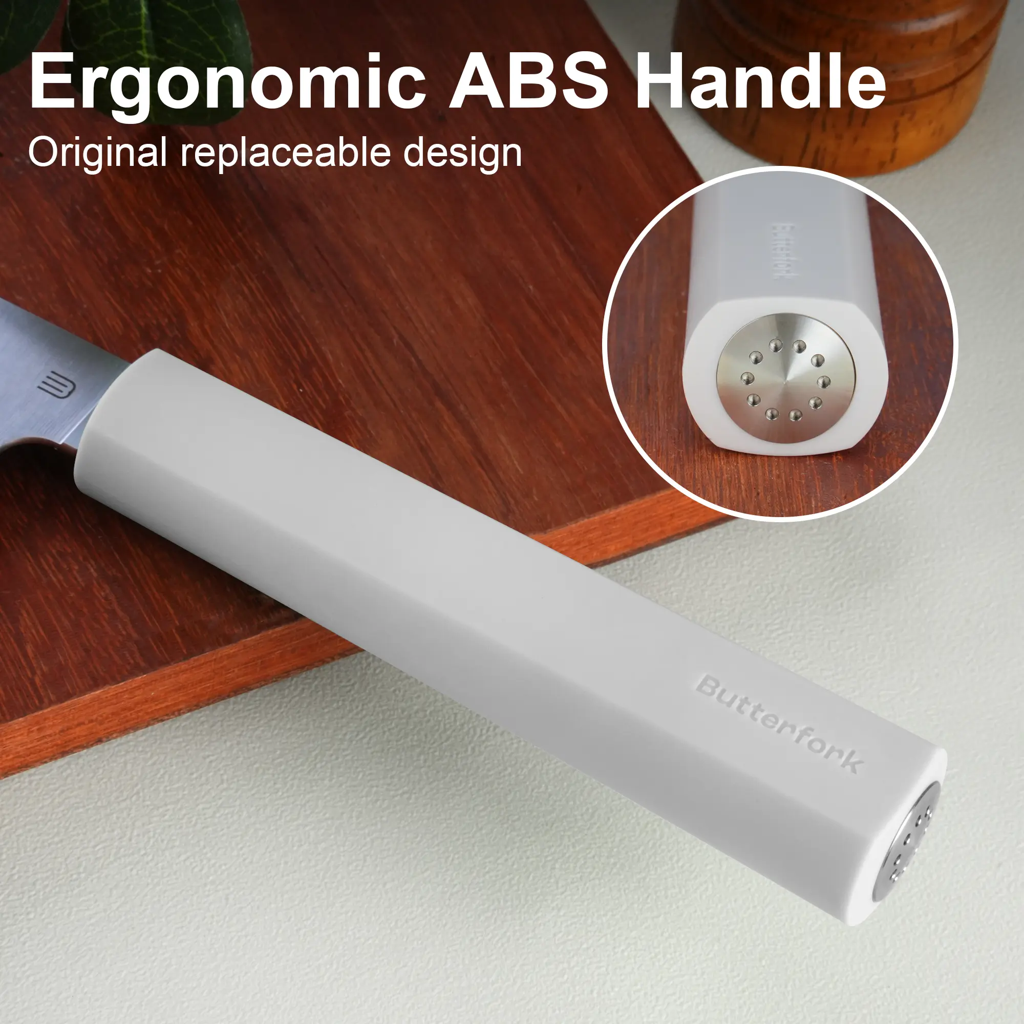 At the same time, Considering the modern kitchen's aesthetic and individual preferences for color, we have introduced a design with interchangeable knife handles. Currently, we offer six ABS handle options. We will continue to expand our selection with different materials and colors to complement the styles of our users' home kitchens.