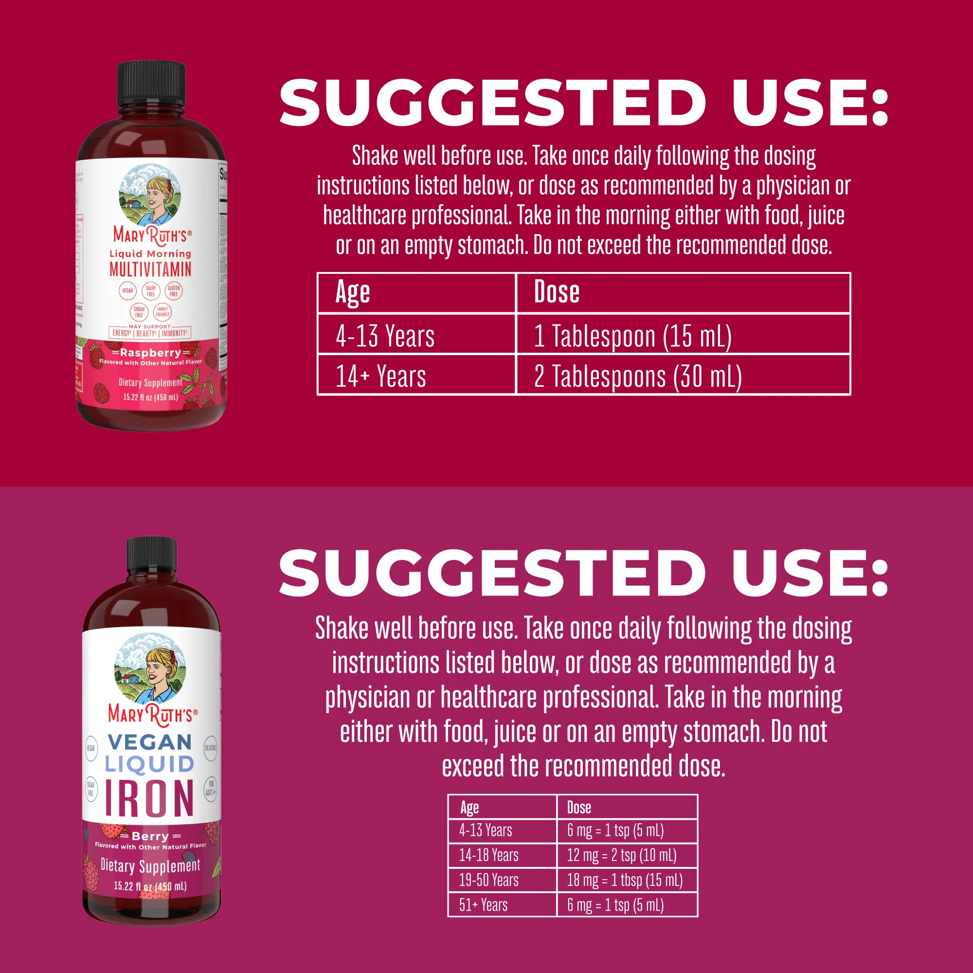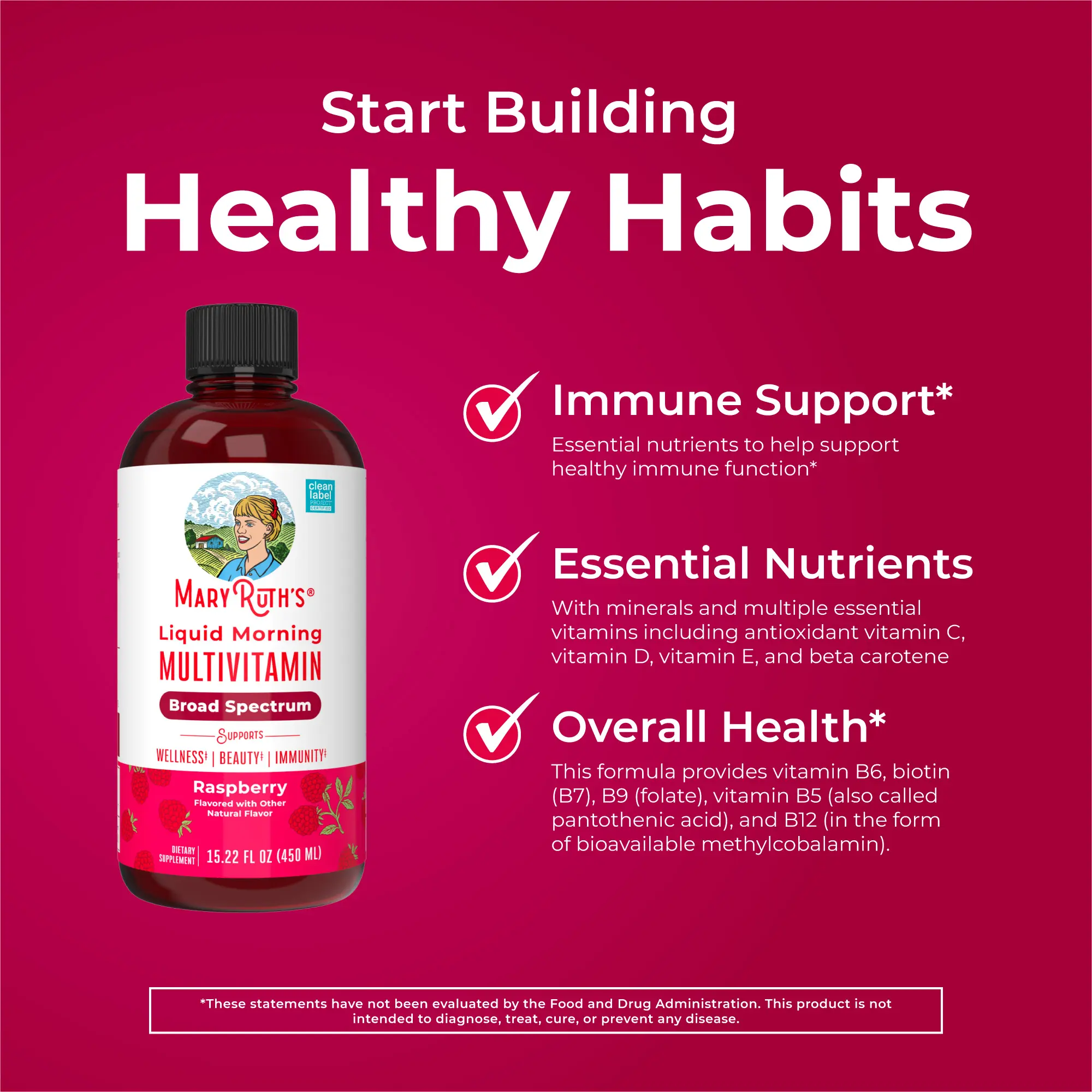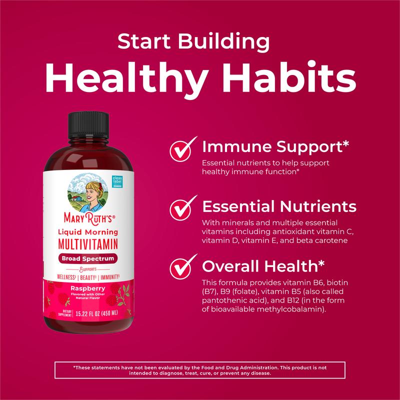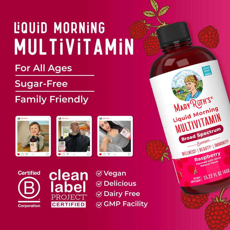 Liquid Daily Multivitamin: Support your body’s nutrient needs, all with no hard-to-swallow pills. MaryRuth’s delicious Raspberry Liquid Morning Multivitamin is an easy-to-take liquid with minerals, amino acids, and multiple essential vitamins including antioxidant vitamin C, vitamin D, vitamin E, and beta carotene.
