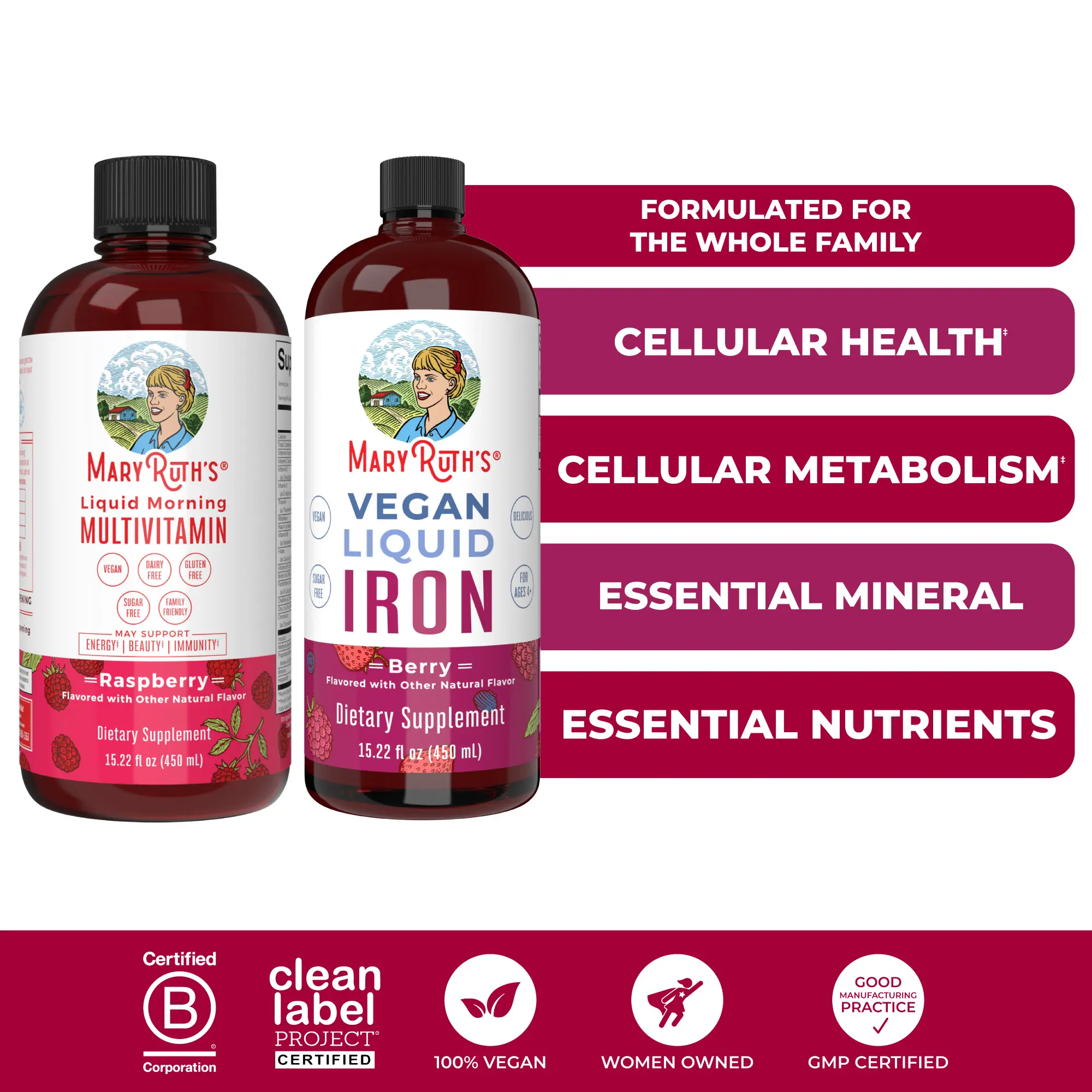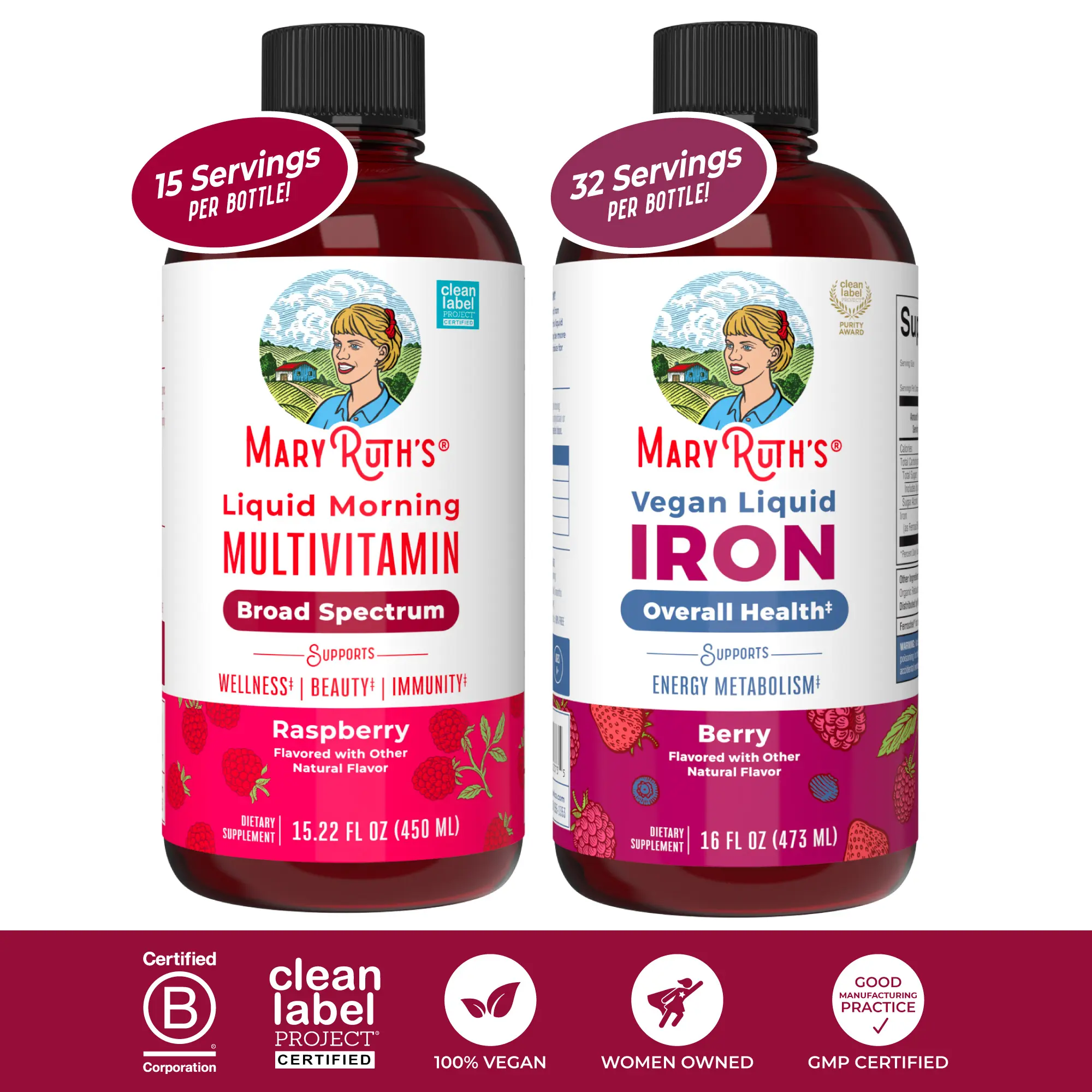 For Most Lifestyles: MaryRuth's Liquid Iron supplement for kids and adults is Non-GMO, Vegan, No Artificial Colors. Made in a GMP (Good Manufacturing Practice) Facility. Dairy Free, Nut Free, Gluten Free, Soy Free, Sugar Free. Clean Label Project Certified. B Corp Certified.