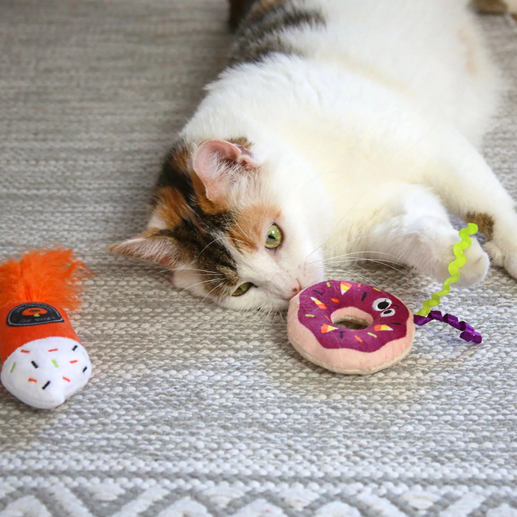 Our Mad Cat Festive Fall Treat 2 pack is an adorable cuddly soft plush Halloween cat toy filled with tempting crinkle paper for enticing sounds that engage cat's senses! Filled with our catnip and silvervine blend, Silvernip®, for twice the cat attractants! Bat, chase or pounce these plush characters!