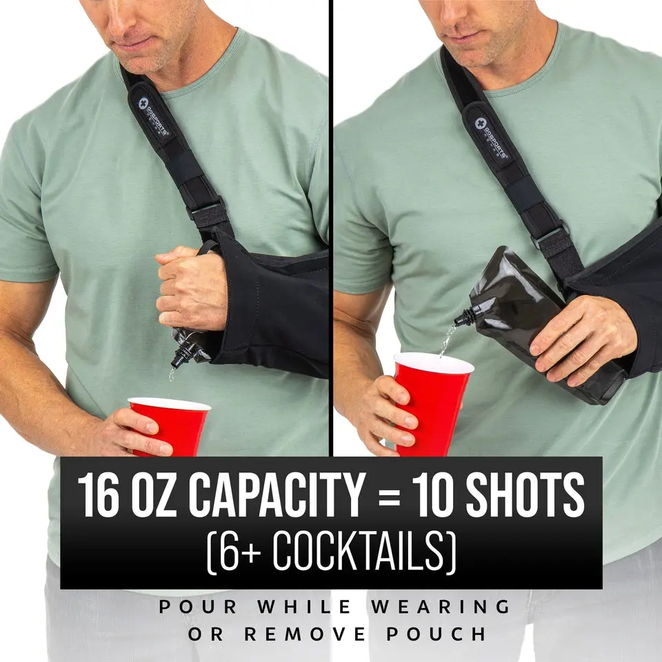 Brace yourself for fun! GoPong's Arm Sling Flask looks like the real thing so you can fill the hidden pouch with your favorite drink and take it to almost any event. The unassuming design won't draw any attention from security and includes 5 reusable drink bags, which makes it great for taking to nightclubs, festivals, theme parks, on cruises, and more. Like you, we hate overpaying for drinks, so each drink bag holds 16 oz and can easily be filled using the included funnel and liquor bottle pour spout. The screw caps provides air tight seals to prevent any leaking of liquid or odors. Once you are ready to drink, simply unscrew the cap and pour directly from your sling (or remove entirely) to mix with your favorite beverage. The sling features an adjustable strap as well to accommodate almost any adult and can be comfortably worn on either arm. We do not condone any illegal uses. Please remember to always obey all local drinking laws.