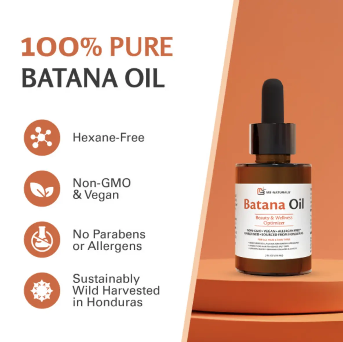 ·Sourced From Honduras - Our Batana Oil from Honduras is rich in fatty acids and vitamins and is derived from pure & unrefined kernels of the American Oil Palm. Relish all the beauty benefits of our Batana Oil and rest assured that each bottle is free from hexane, parabens, fragrances, and allergens.