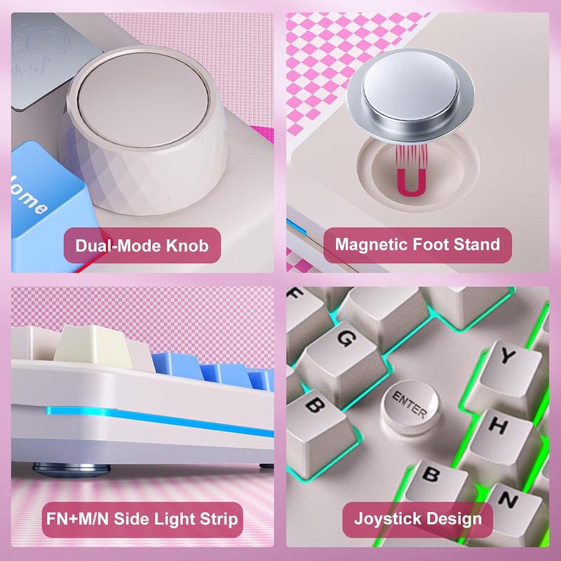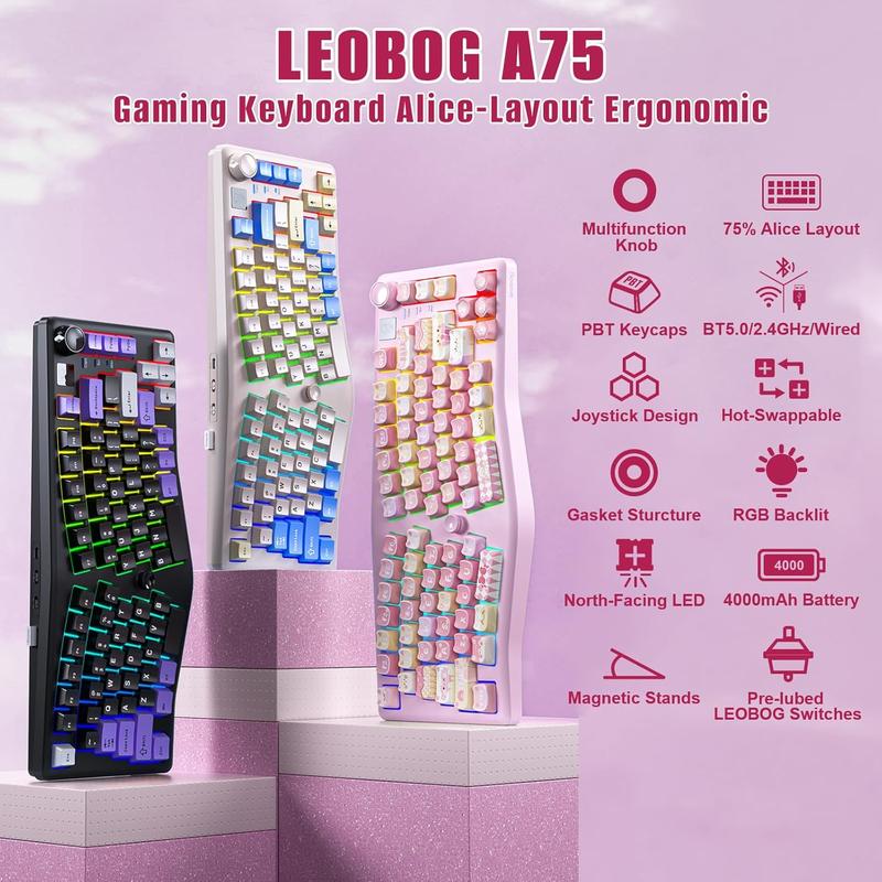 ·Ergo & Multifunction Knob: LEOBOG A75 Wireless Gaming Keyboard is both comfortable and versatile. The ergo keyboard features an ergonomic Alice layout with gentle angles to provide a natural position for your hands and fingers to relax, even after long hours of typing. The function knob can easily switch between work and gaming modes to adjust the volume and RGB brightness to meet the needs of different scenes of use. Whether working or gaming, A75 provides an excellent input experience