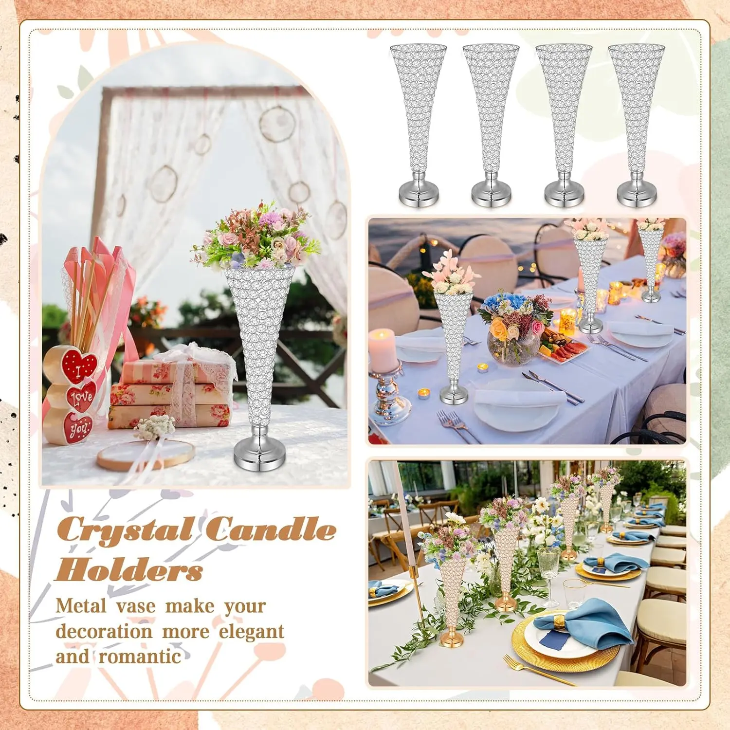 Rtteri 4 Pcs Crystal Trumpet Flower Vase 20 Inch Tall Wrought Iron Crystal Vase Flower Stand Centerpieces Wedding Table Vases Decor for Home Anniversary Ceremony Party Event Christmas (Silver)