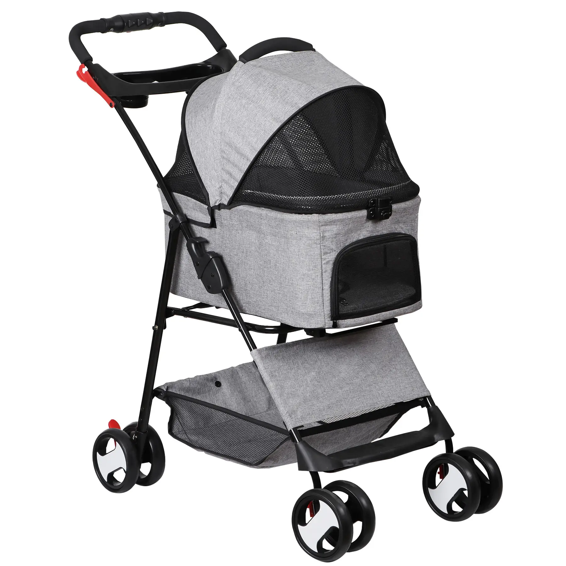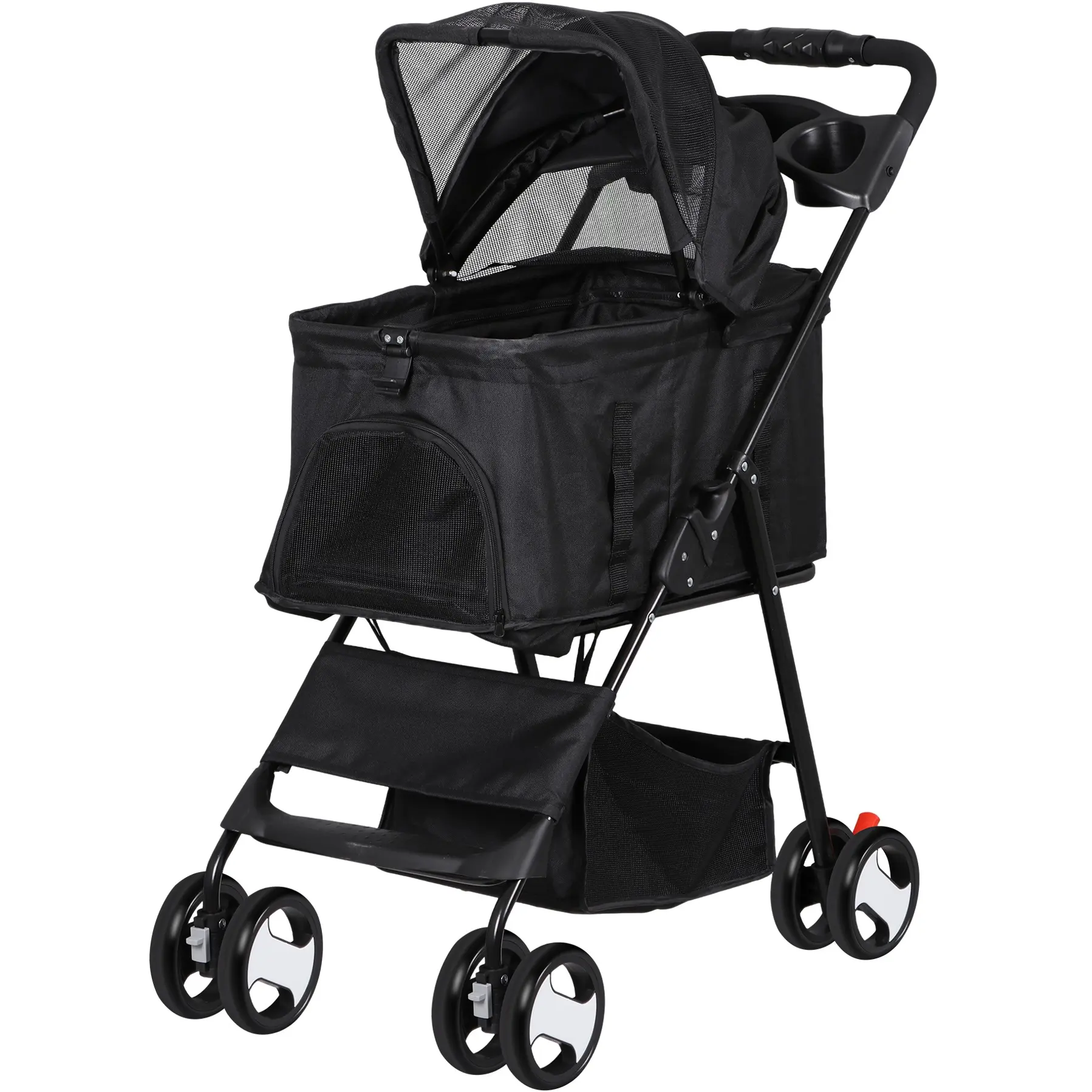 The stroller includes two cup holders conveniently placed near the handle and an extra-large storage basket underneath, perfect for keeping essentials like your purse, pet toys, treats, and water bottles within easy reach.