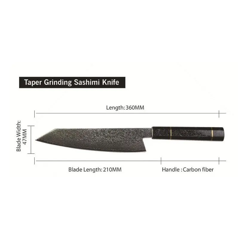 We imported 67 layers of Damascus steel chef's knife from Japan. This is a multi-functional professional kitchen Damascus knife with a durable blade that can perfectly cut, cut, slice and dice, and be used with vegetables, fruits and meats. Unique rod-shaped design. The surface is brighter and more comfortable. The handle material is mainly imported resin, carefully selected color wood, double copper ring decoration, not rusty. The brocade pattern improves stain resistance and prevents food from sticking to the knife. The tapered grinding of the blade achieves a very high sharpness. The handle allows maximum control of movement with minimal effort. Durability and good balance, combined with corrosion resistance and elegant brocade patterns, make this knife worthy of professional use. Super anti-rust. It is an ideal choice for professional chefs, kitchen experts, food suppliers and novice home cooks