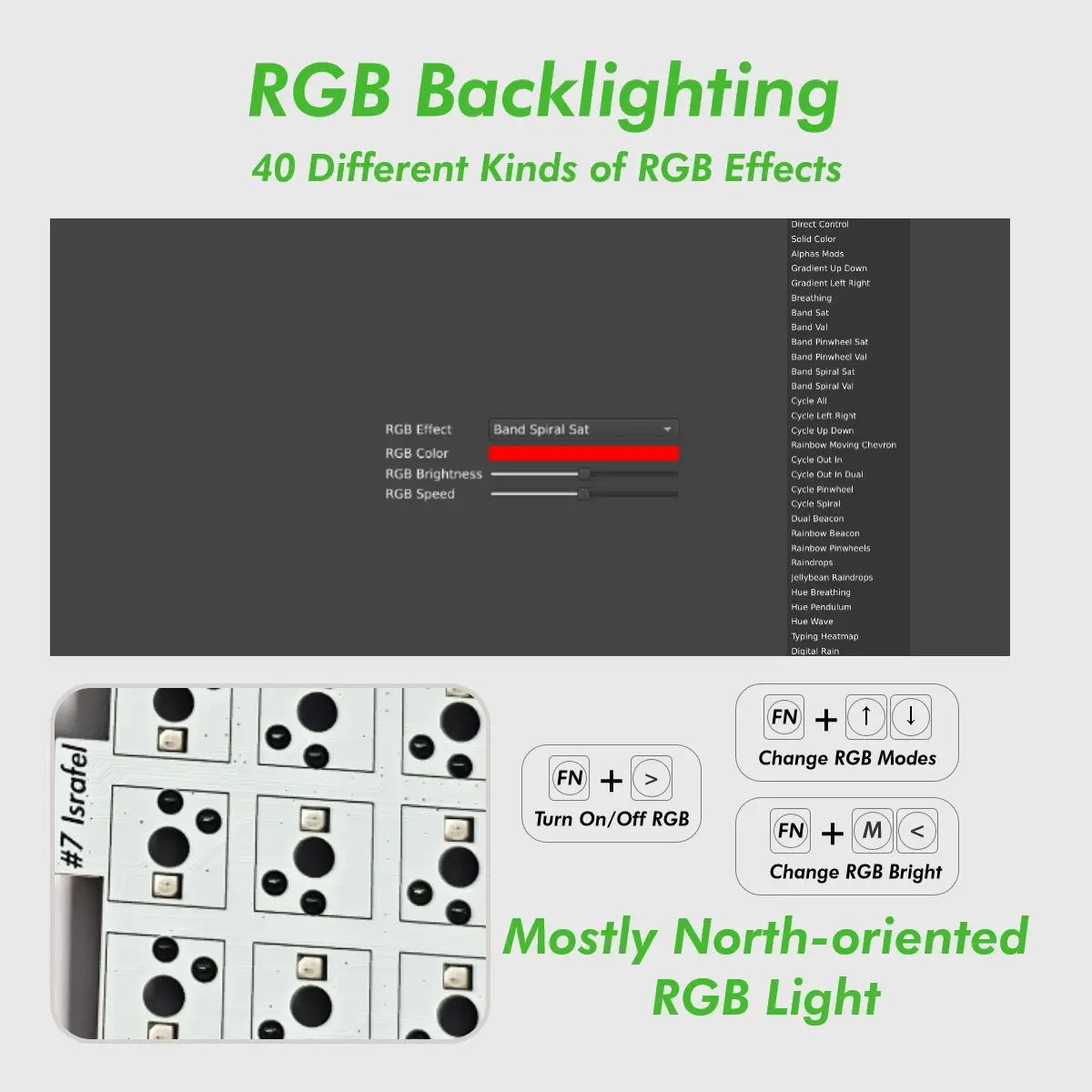 Israfel offers powerful customization features, allowing users to configure key mappings, macro commands, and lighting effects through Vial software. You can define the function of each key, set up various shortcuts, and program macro combinations, enhancing workflow efficiency.