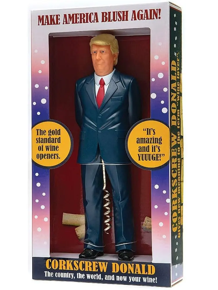 • MAKE AMERICA BLUSH AGAIN - Trump-shaped opener features a golden corkscrew that lifts from between The Donald's legs to pop the bottle's cork in a New York minute.