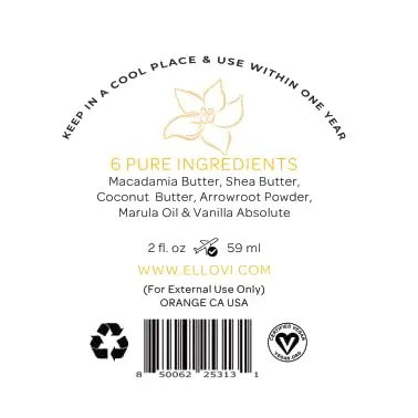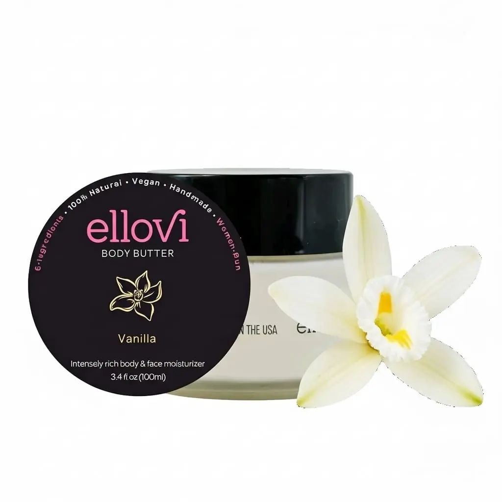 Ellovi Vanilla Body Butter is made with pure therapeutic-grade essential oils. It offers authentic and delicate scents for aromatherapy and healing properties. The ultra-rich formula leaves skin glowing with just a small amount. No preservatives or fillers, unlike most moisturizers that contain water and chemicals.