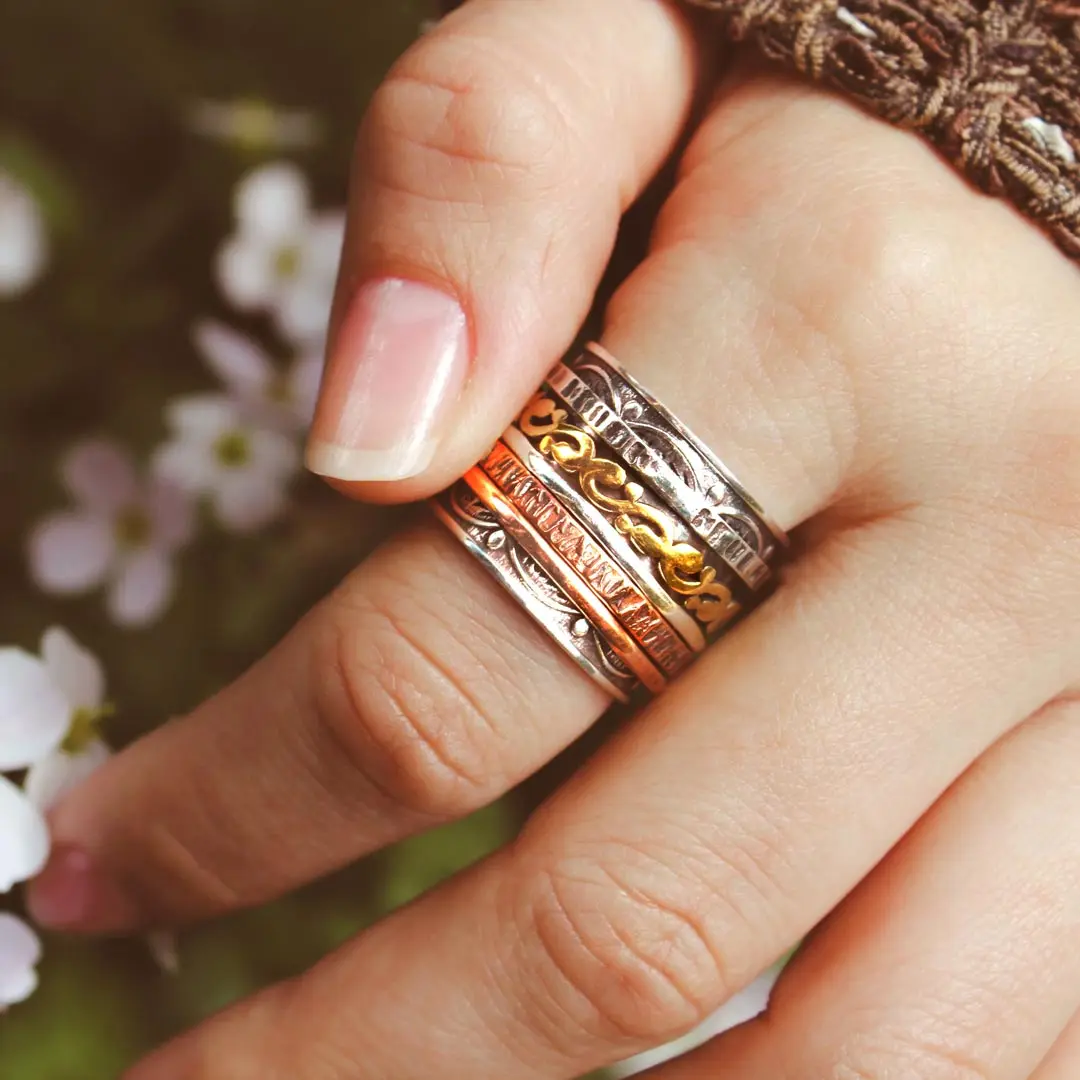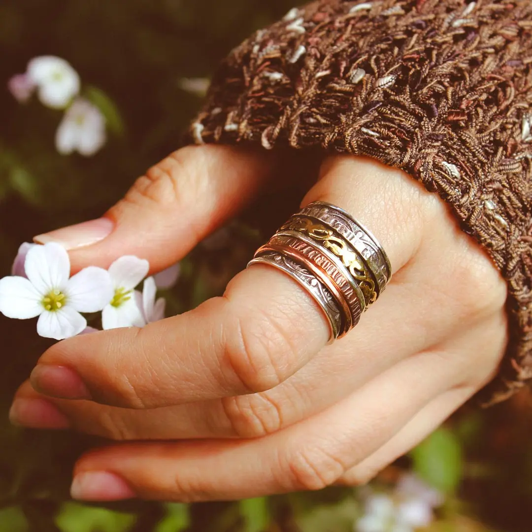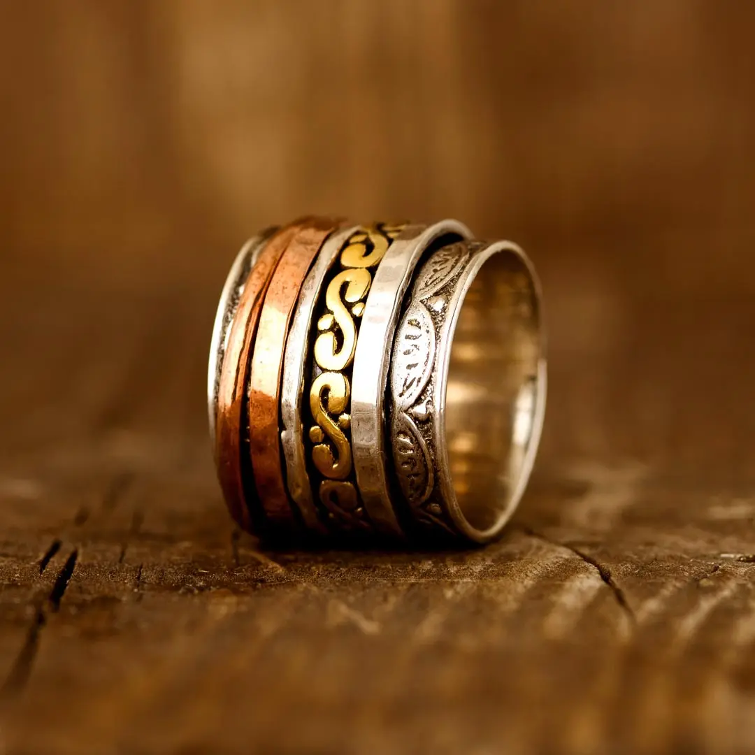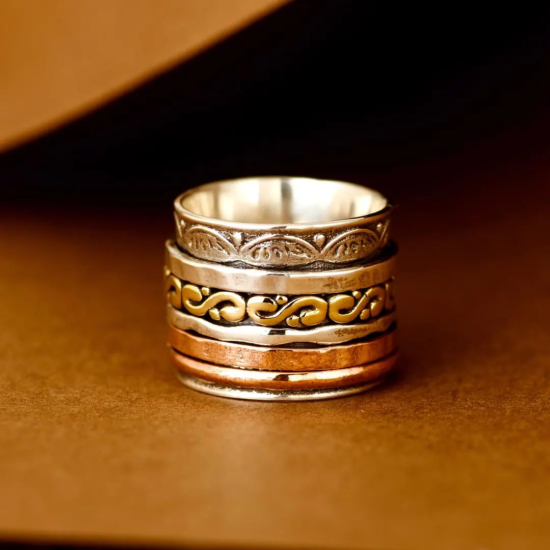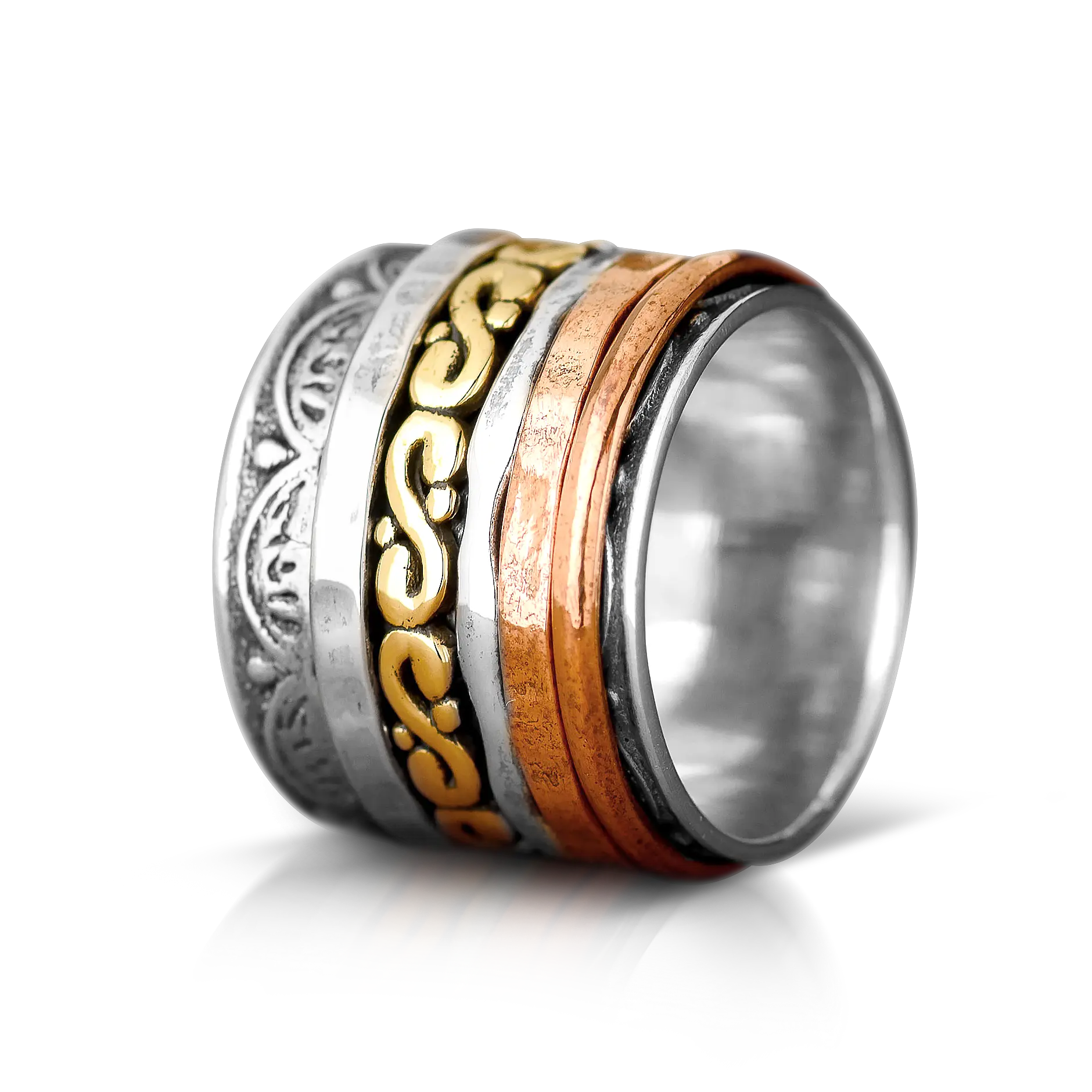 This wide-band tricolored sterling silver fidget ring makes a huge statement! The mixed metals bring a gorgeous boho flare to your outfit. This ring features multiple rings that smoothly spin around your finger. It's so addicting to spin, we just know this ring will become a favorite!