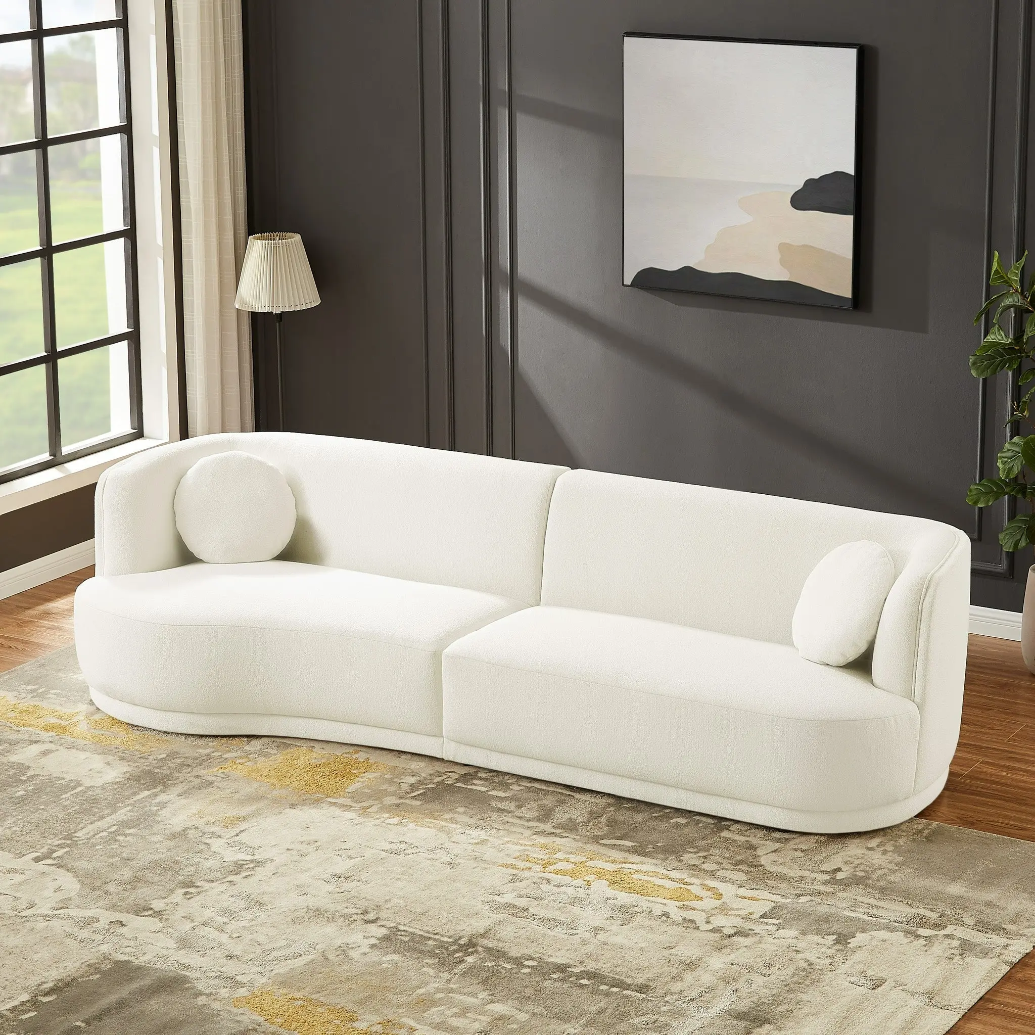 The Paris sofa inspired by mid century modern japandi style, rounded silhouette sofa. Wrapped in textured boucle fabric, brings modern style to any space. Crafted with a durable hardwood frame and spill-resistant upholstery, it arrives fully assembled for instant relaxation.