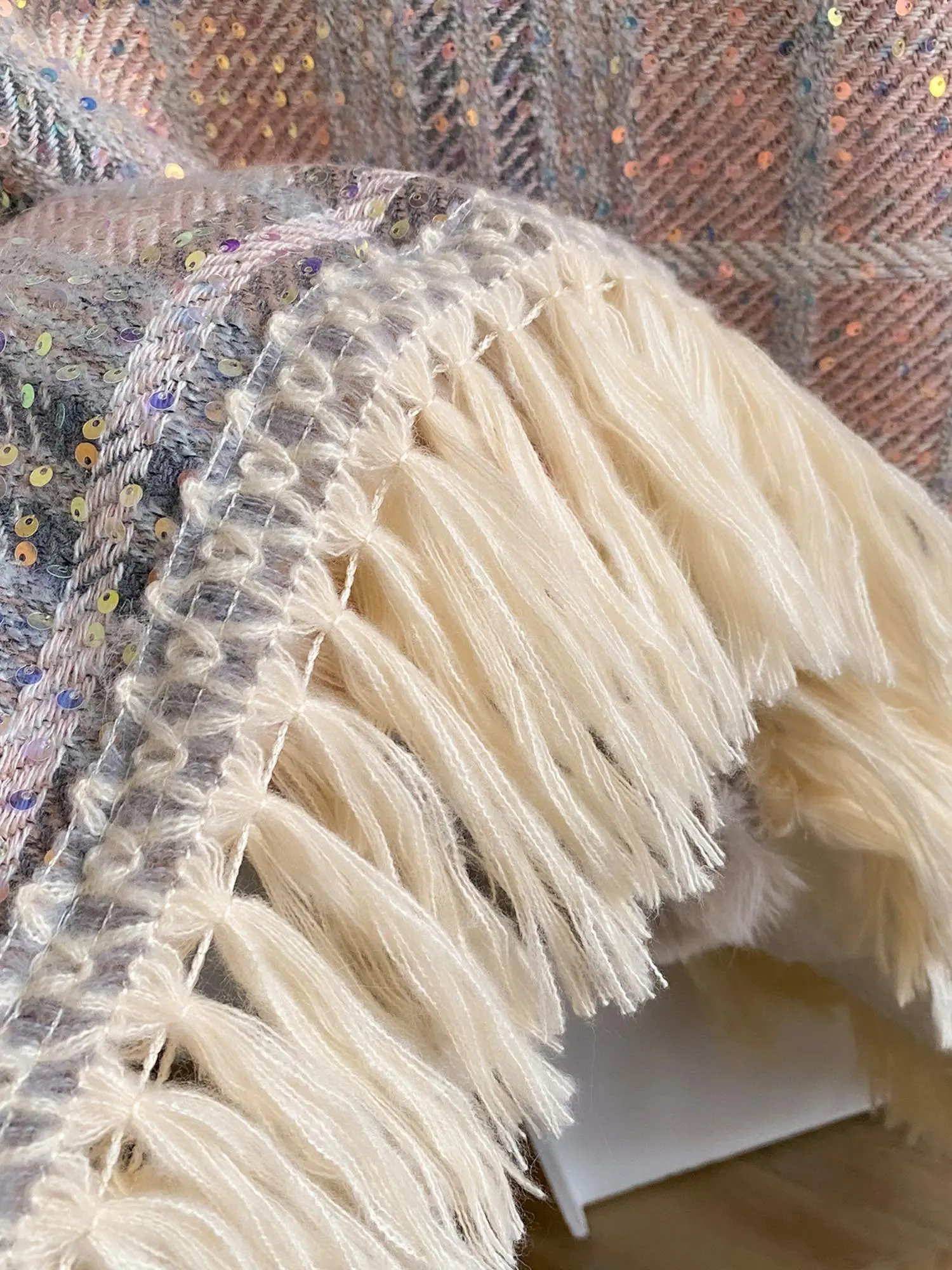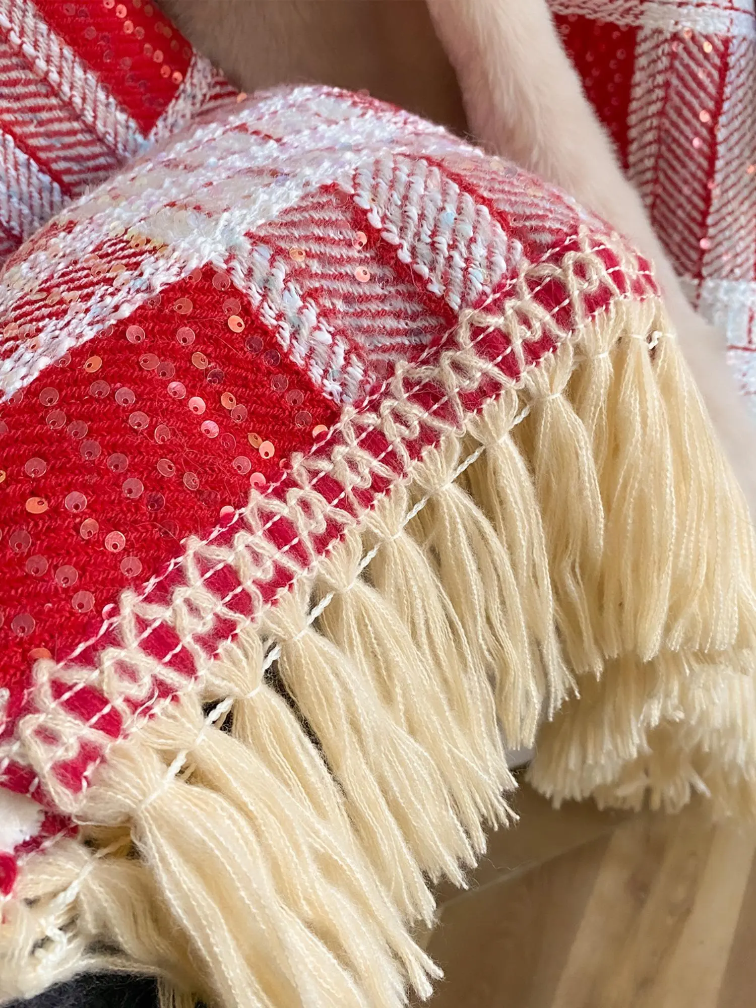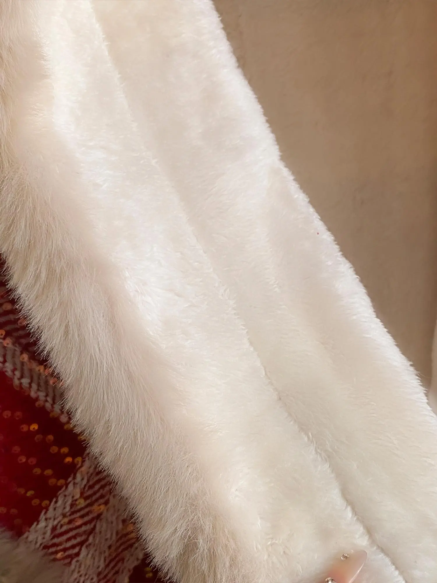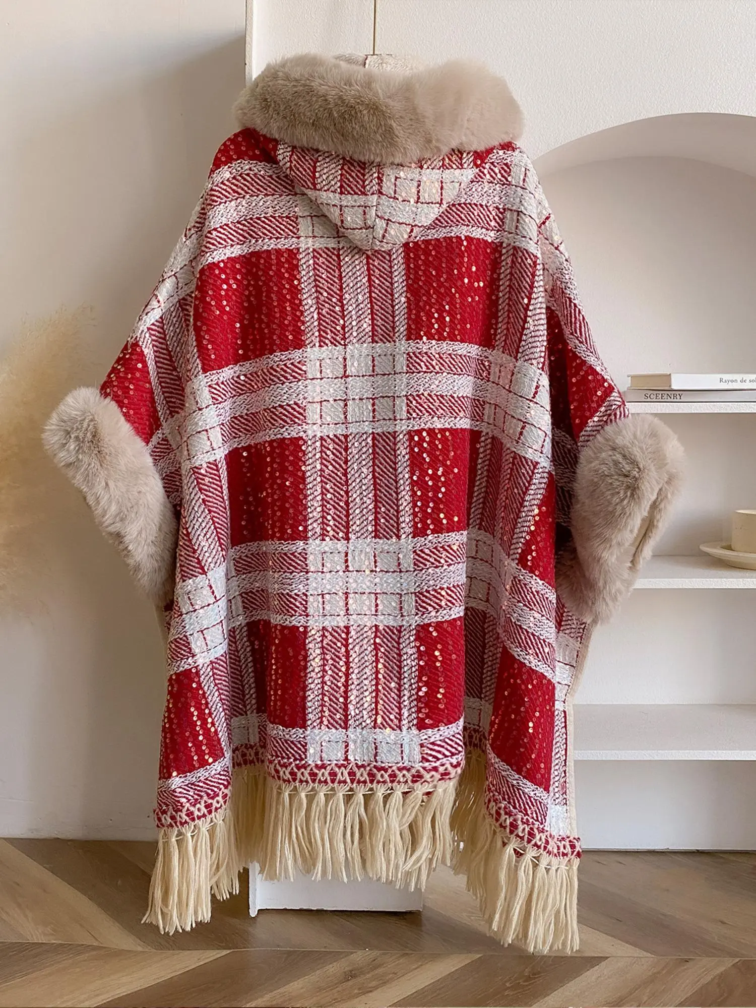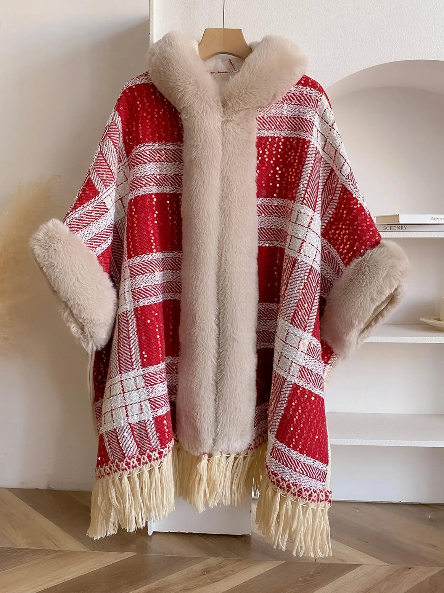 Women's Tartan Print Fur Trim Shawl Collar Cape Coat, Casual Fringe Trim Long Sleeve Open Front Outerwear for Fall & Winter, Women's Clothing for Daily Wear, Lady