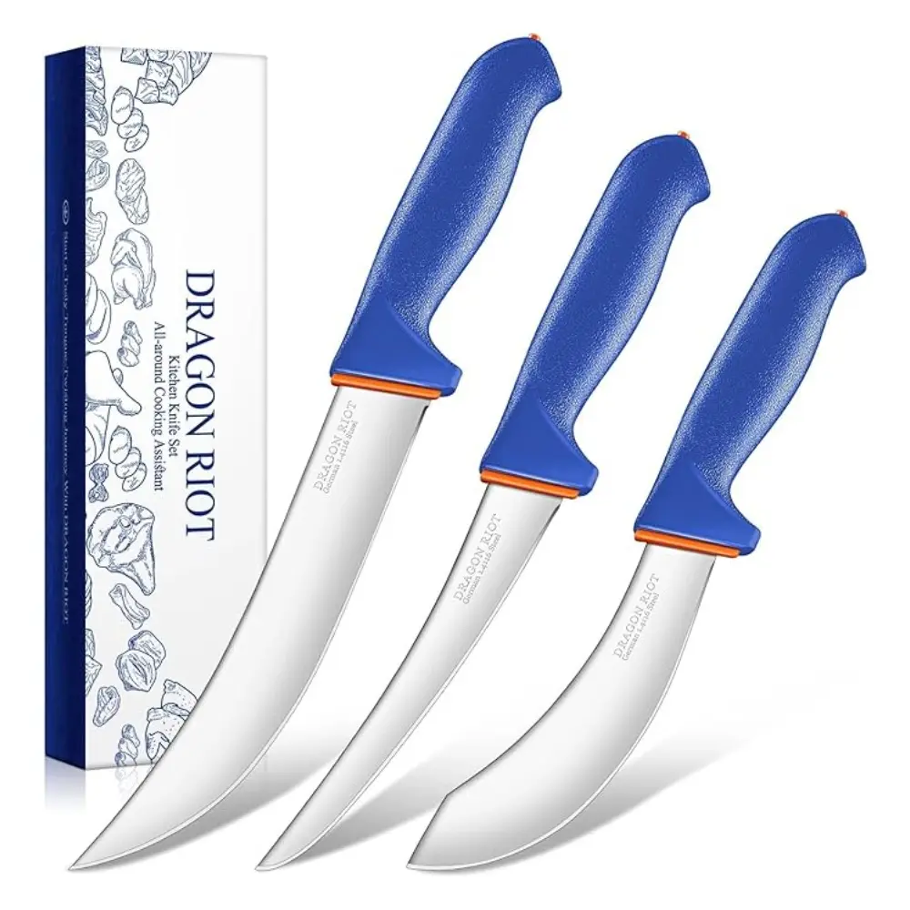 ·DRAGON RIOT BUTCHER KNIFE SET-The set Includes 6" Boning Knife, 6" Skinning Knife, 10" Butcher Breaking Knife.The butcher knife set can easily handle all your daily kitchen tasks as the versatile knives let you enjoy cutting, carving, slicing, chopping, and mincing meat, fruits, vegetables, and more.This pro chef knife set, designed for kitchen use, has been the top choice of both home chefs and professionals alike.
